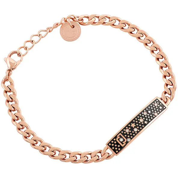 Ženska narukvica italijanskog brenda Liu Jo izrađena od nerđajućeg čelika u boji roze zlata sa priveskom u obliku pločice sa umetnutim kristalima. Dužina ogrlice je 17,5cm i napravljena je od hirurskog čelika. Pogodna je za svakodnevno nošenje.