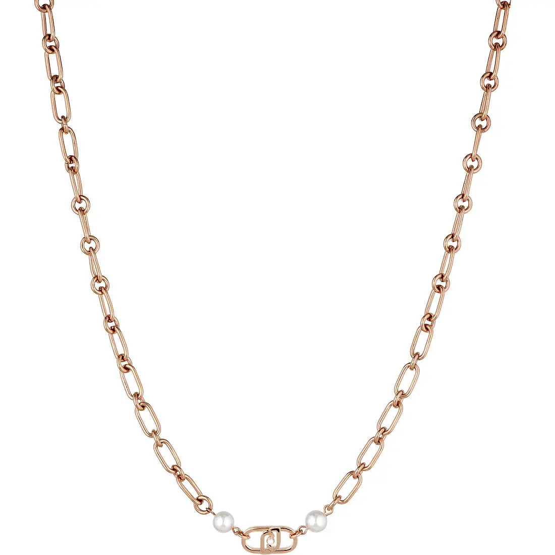 Bezvremenska ženska ogrlica brenda Liu Jo. Napravljena od visokokvalitetnog hiruškog čelika u boji roze zlata što ogrlici daje znak luksuza. Ukrašena šarmantnim sintetičkim perlama sa ornamentom dizajna logotipa. Izgledaćete sjajno u svakom trenutku.