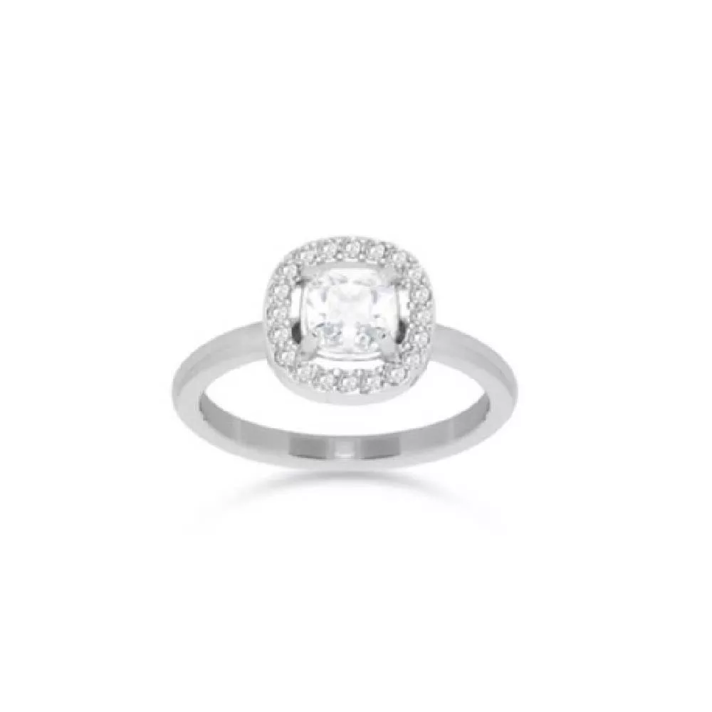 Liu Jo prsten od nerđajućeg čelika u srebrnoj boji sa belim cirkonima i jednim većim providnim cirkonom u obliku kvadrata.