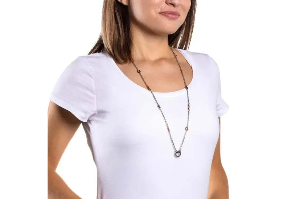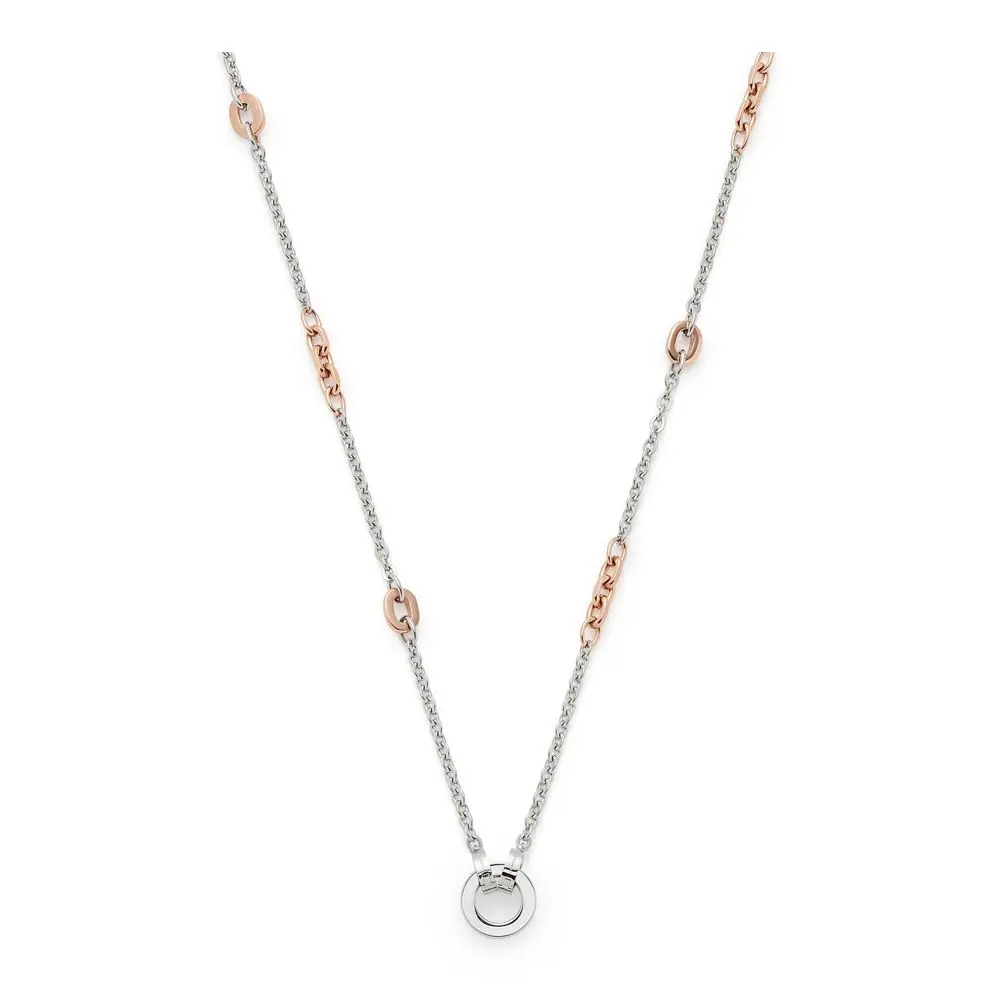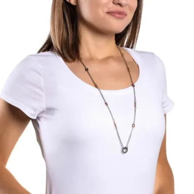 Ogrlica brenda Leonardo u kombinaciji srebrne i boje roze zlata.Ukrašena je priveskom u obliku kruga srebrne boje.Upotpuniće Vašu svakodnevnu odevnu kombinaciju.