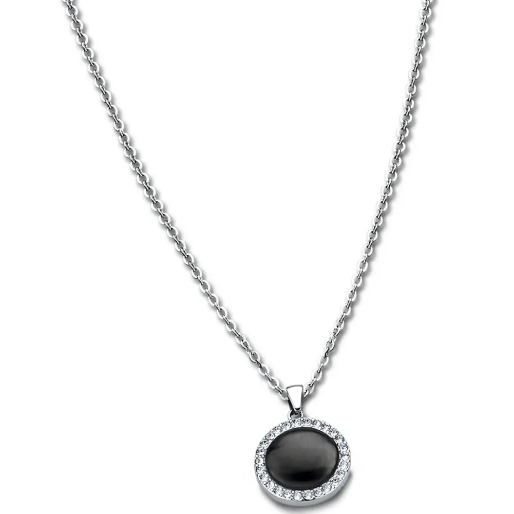 Svedena ogrlica brenda Lotus izrađena od nerđajućeg čelika sa okruglim priveskom u crnoj boji koji je ukrašen cirkonima savršen je izbor za svaku damu sa stilom.