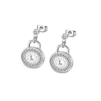 Lotus moderne minđuše od nerđajućeg čelika sa istaknutim logom brenda upotpunjene cirkonima.