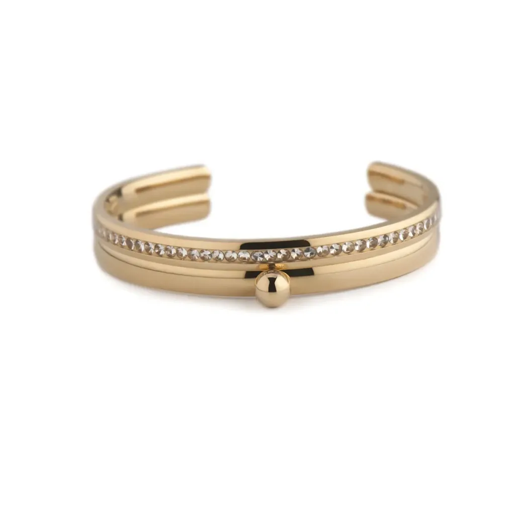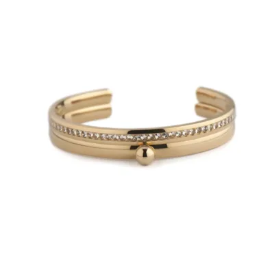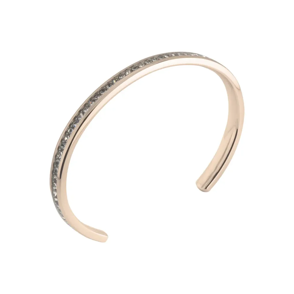 Tanka, čvrsta naruvkvica u roze-zlatnoj boji sa redom kristala, holandskog brenda MelanO Colors se lako kombinuje uz svakodnevnu odevnu kombinaciju i sa drugim nakitom.