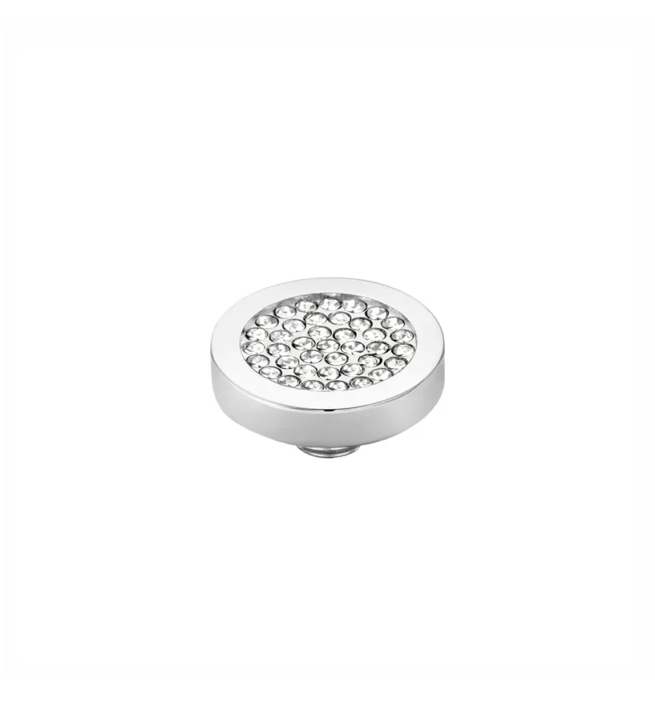Kamenčić u srebrnoj boji u obliku okrugle ploče u kojoj su smešteni sitni kristali transparentne boje, holandskog brenda MelanO Colors se može lako zameniti u osnovu elementa, bilo da je to prsten, minđuše ili narukvica i prilagoditi vašem raspoloženju ili trenutnoj odevnoj kombinaciji.