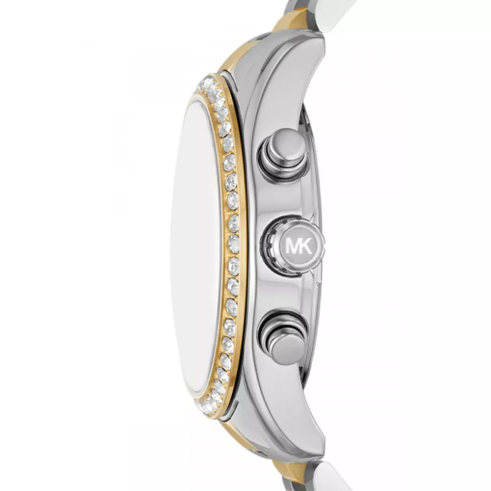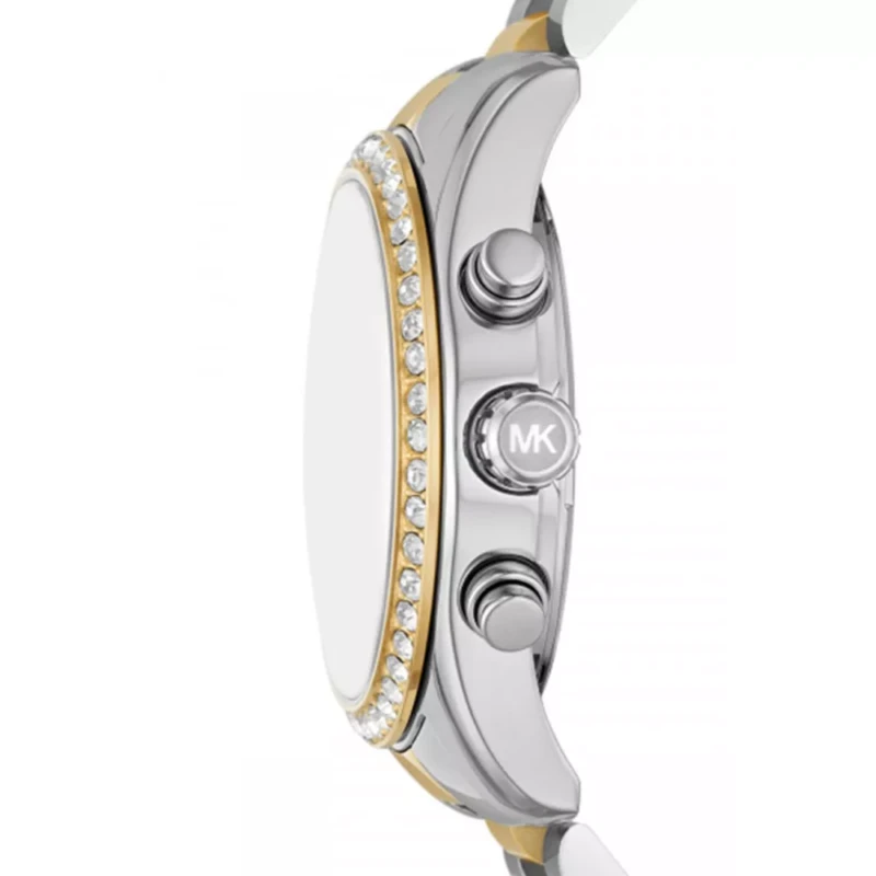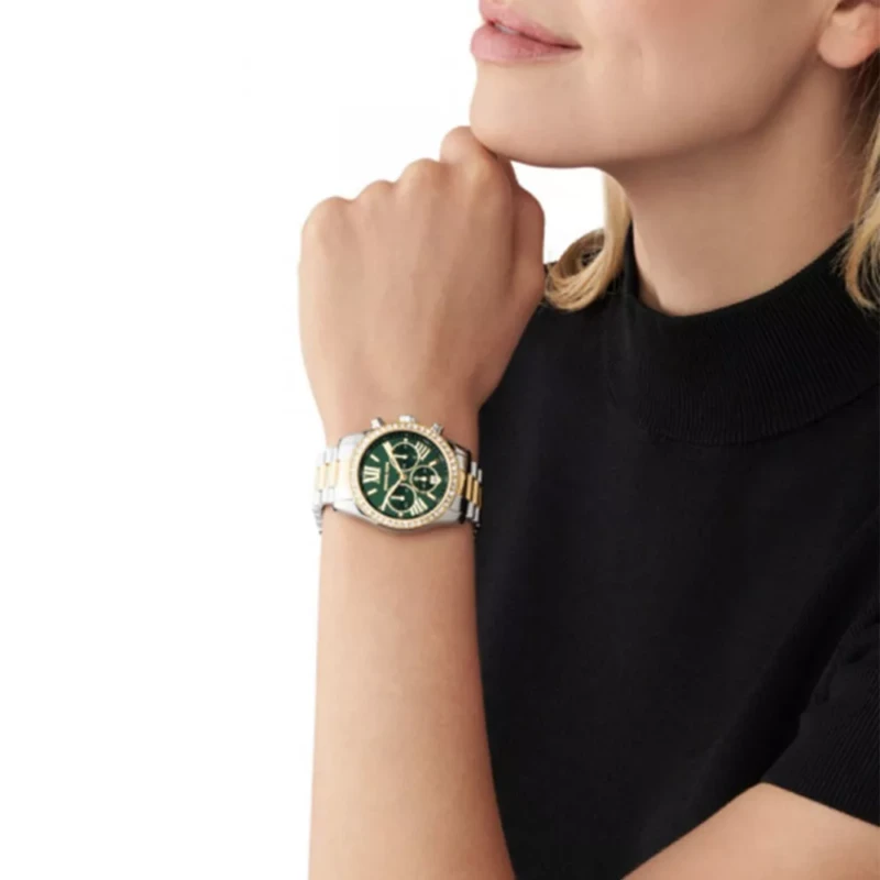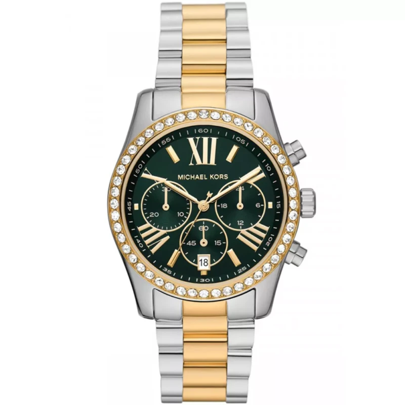Ženski ručni sat brenda Michael Kors iz kolekcije Lexington. Kućište je izrađeno od nerđajućeg čelika u boji srebra, sa brojčanikom u tamnozelenom tonu i detaljima koji su izvedeni u zlatnoj boji. Ovaj elegantni model dolazi sa metalnom bi kolornom narukvicom.