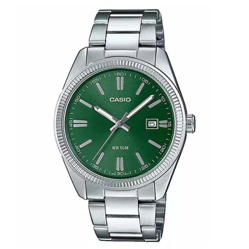 Muški ručni sat brenda Casio. Kućište i narukvica su izrađeni od kvalitetnog nerđajućeg čelika. Brojčanik sa prikazom datuma je u crvenoj boji.