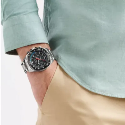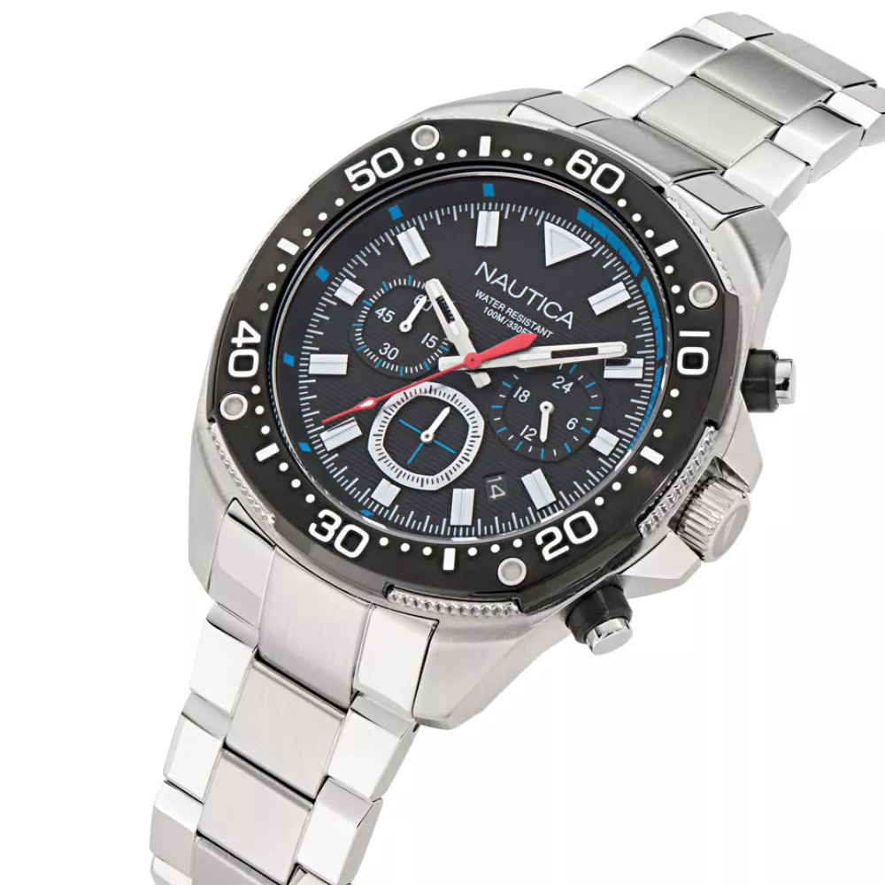 Upoznajte NCT Blue Sail, hronograf sat s odvažnim dizajnom i modernim stilom. Sat poseduje fiksni IP četvrtasti okvir i karakteristične zavrtnje, crni brojčanik, kućište prečnika 46 mm i narukvicu od nerđajućeg čelika. Prikaz datuma na poziciji broja 4.