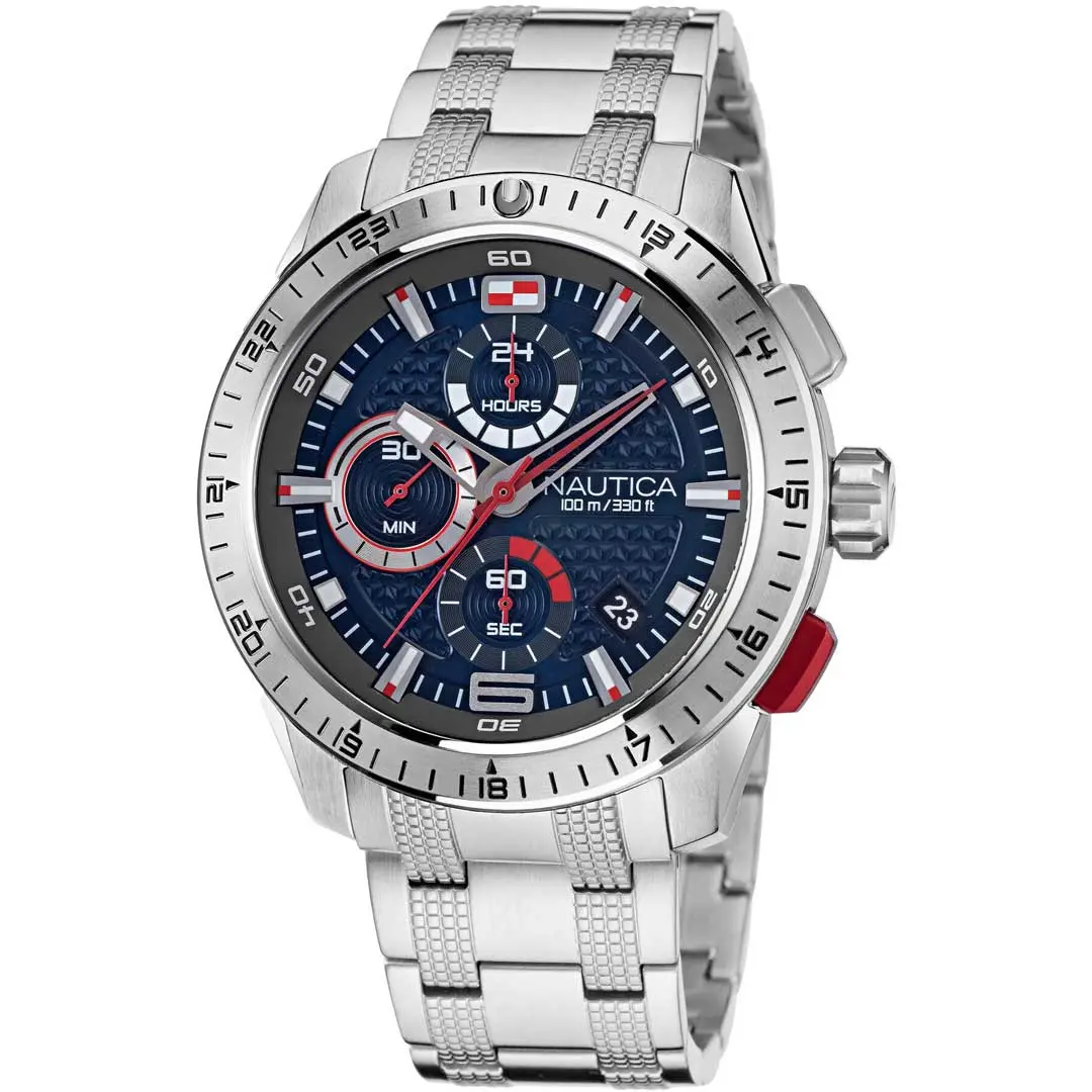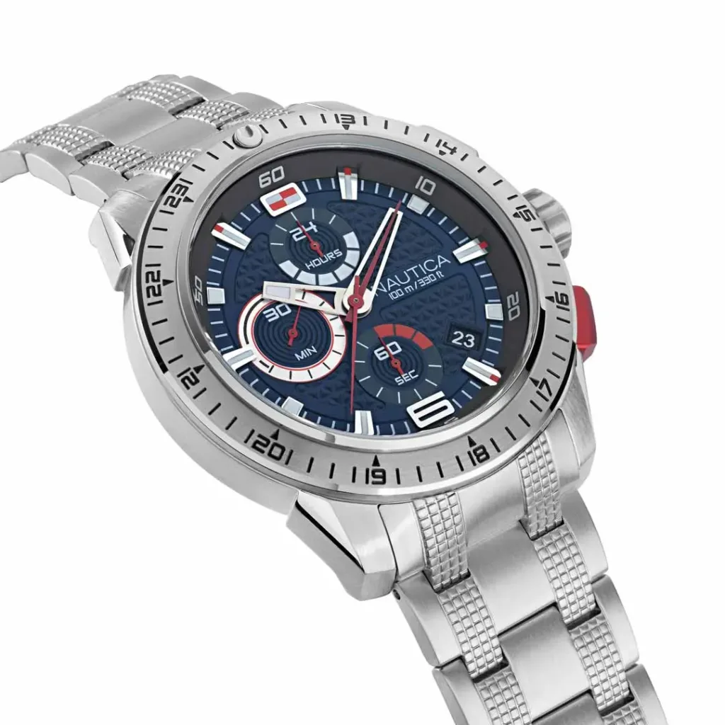 Moderan muški ručni sat brenda Nautica iz kolekcije NST 101 na čeličnoj narukvici sportskog dizajna. Multifunkcionalni plavi brojčanik osvežen je preglednim belim indeksima sa crvenim detaljima. Crvena boja dominira kao poseban detalj na ovom modelu. Namenjen je muškarcima koji uzivaju u sportskom načinu života.