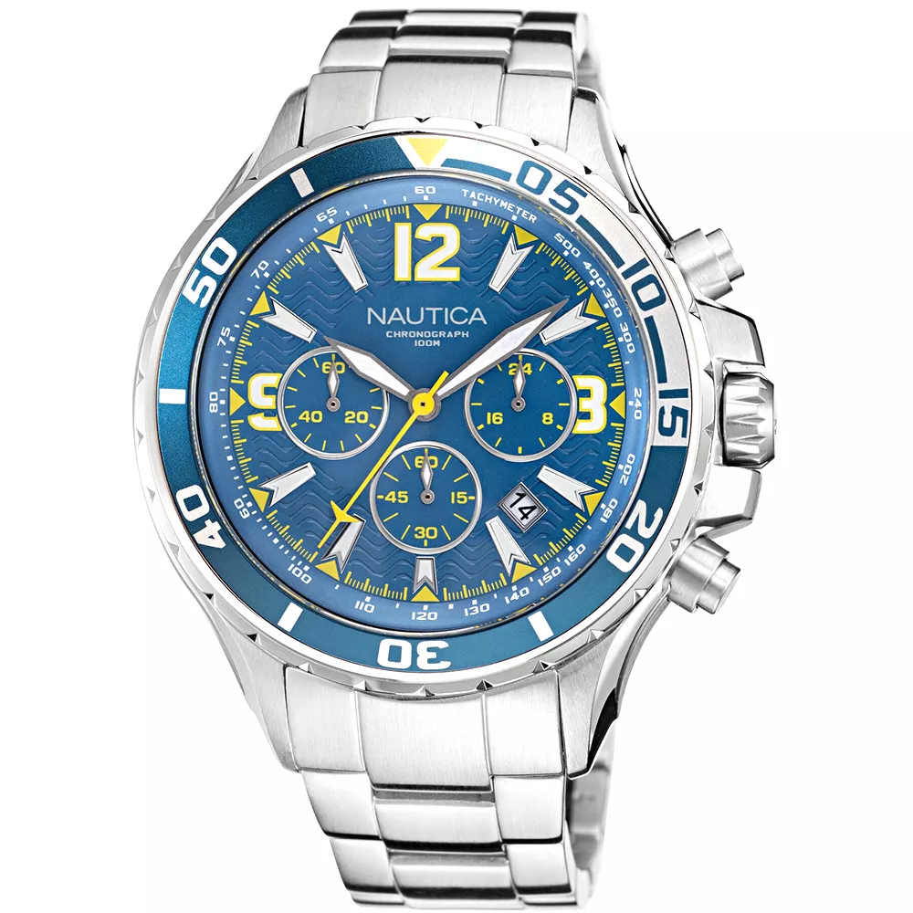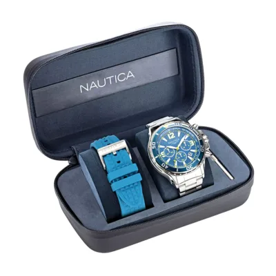 Muški ručni sat brenda Nautica sa dodatnom silikonskom narukvicom. Kućište modela izrađeno je od nerđajućeg čelika u srebrnoj boji, kao i narukvica. Brojčanik sa prikazom datuma je u plavoj boji.