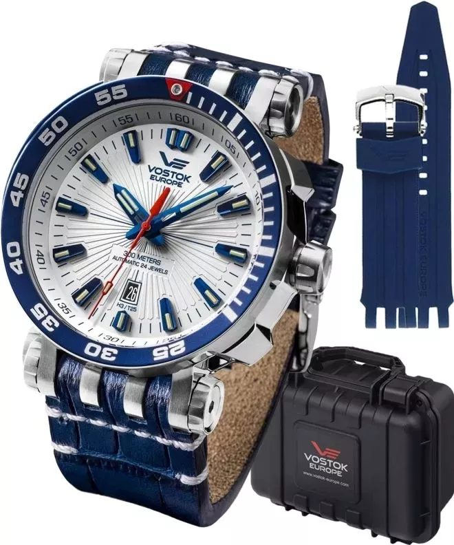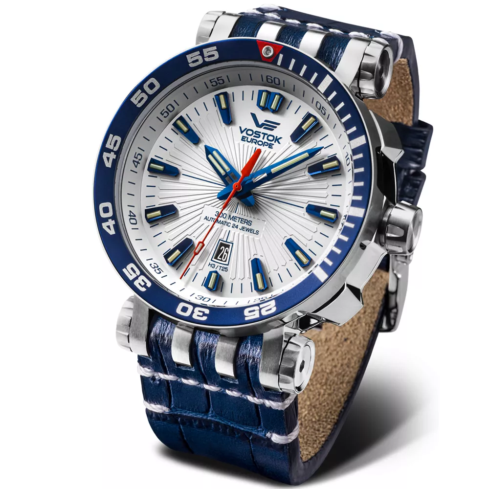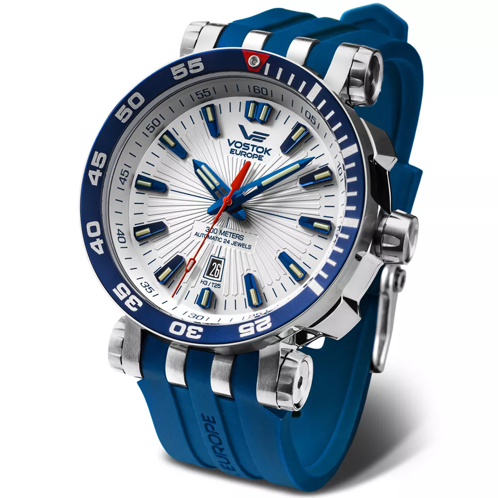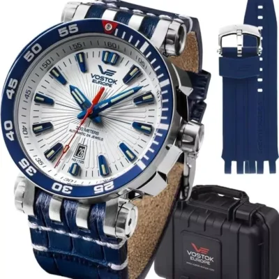 Sportski muški ručni sat Ruskog brenda Vostok iz kolekcije Energia, na plavoj kožnoj narukvici, sa brojčanikom bele boje i plavim detaljima. Poseduje diskretan datum koji je pozicioniran pored broja 6. Kazaljke i indeksi kao osvetljenje pri slaboj svetlosti imaju tricijumske tubice. Kućište je od čelika, otporan je na vodu do 300m. Ovi satovi su dizajnirani za korišćenje u različitim ekstremnim aktivnostima, od dubokog ronjenja do istraživanja svemira. Automatski relej za otpuštanje helijuma integrisan je u jednosmerni ventil sa oprugom koji se aktivira kada razlika između unutrašnjeg i spoljašnjeg pritiska dođe do kritičnog nivoa. Ova funkcija je korisna za ronioce koji rade na velikim dubinama. Sat dolazi u setu sa slilikonskom narukvicom kao i alatom za zamenu koji su smešteni u plastičnu kutiju koja je otporna na vodu i udarce.