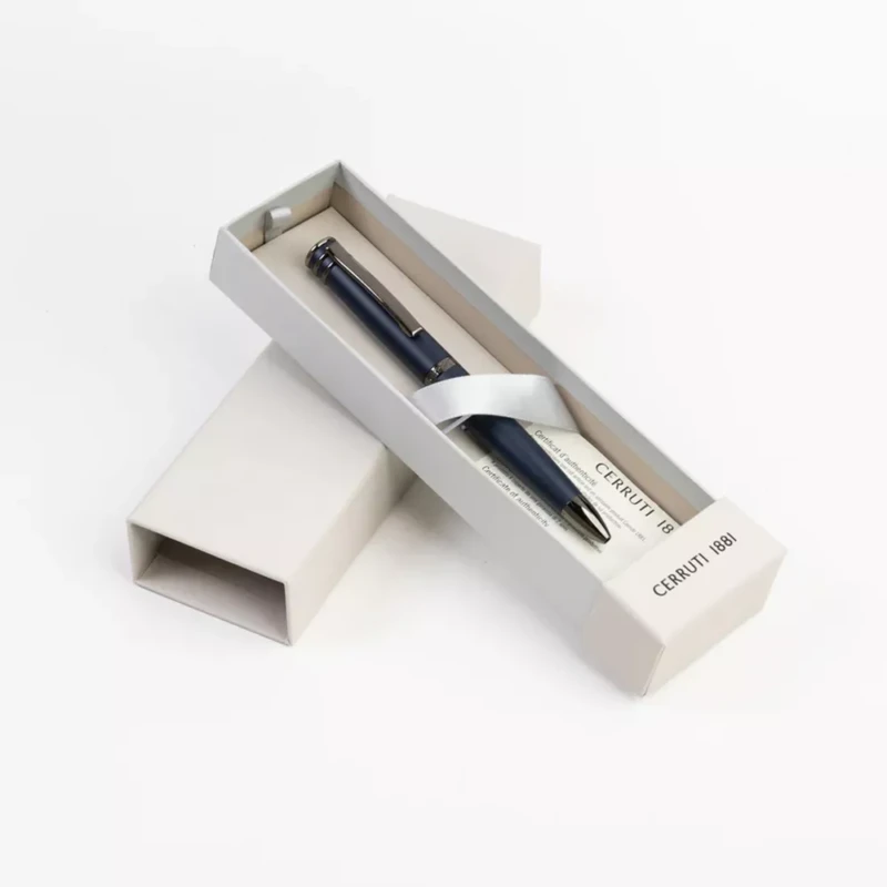 Cerruti hemijsku olovku ističe mat telo ukrašeno elegantno obrađenim metalnim detaljima, koji dodaju notu luksuza i sofisticiranosti. Kombinacija plave i metalik sive boje donosi moderni kontrast, inspirisan aktuelnim modnim pistama.