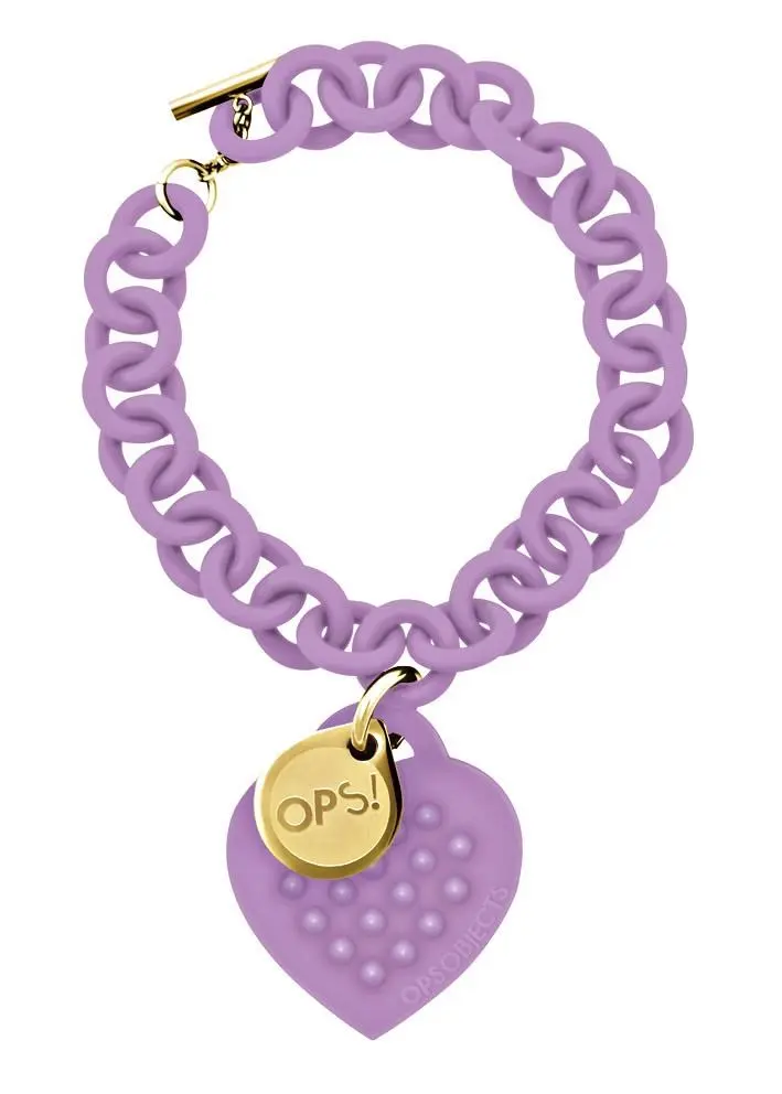 Narukvica napravljena od silikonskih karika sa velikim priveskom u obliku srca na kome su sitni cirkoni