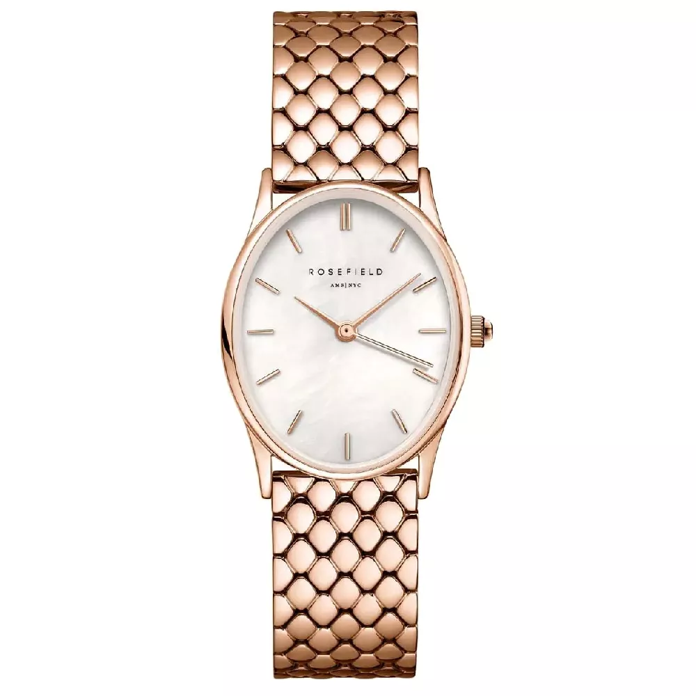 Elegantni ženski sat brenda Rosefield iz kolekcije The Oval sa čeličnom narukvicom i kućištem u roze zlatnoj boji, preglednim ovalnim brojčanikom na kojem se ističe logo brenda kao i prikazom datuma.Svojim dizajnom pogodan je za svaku priliku.