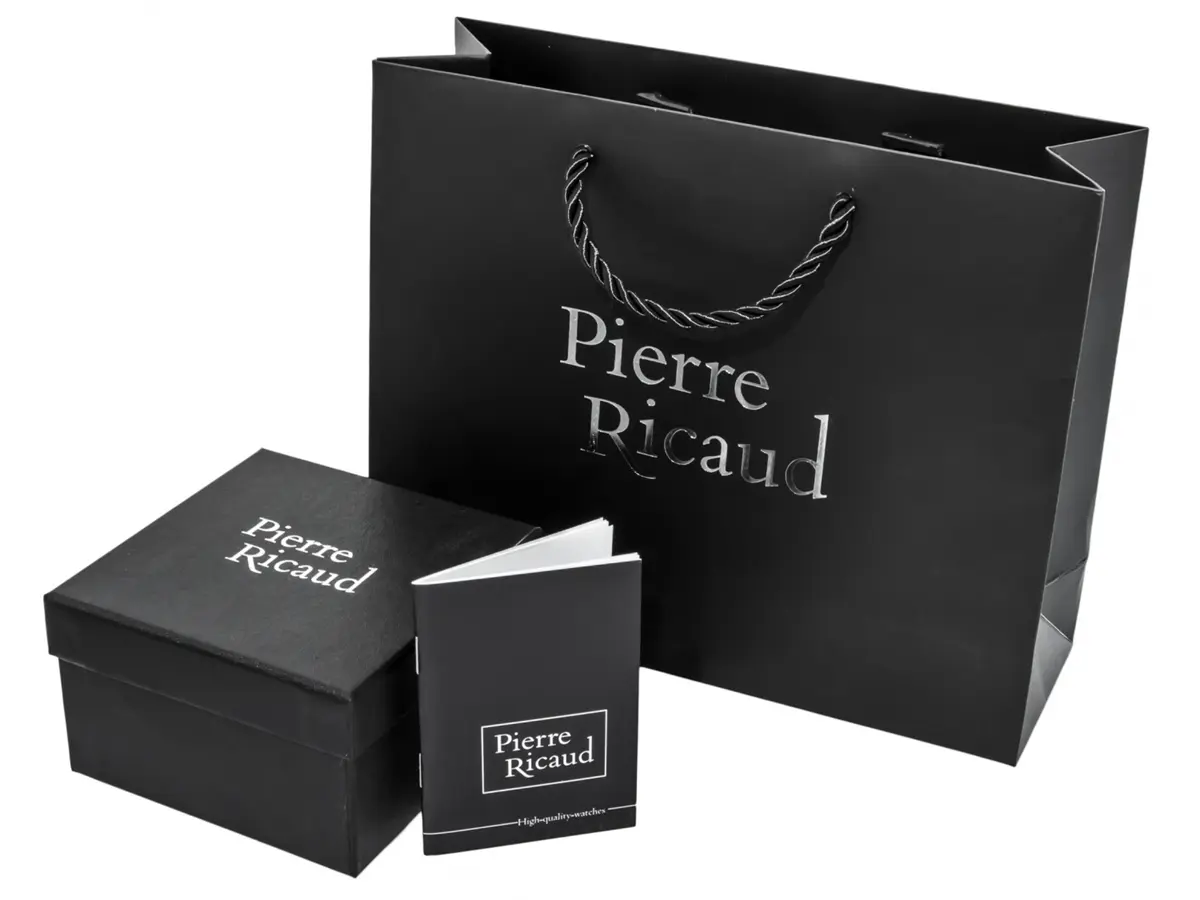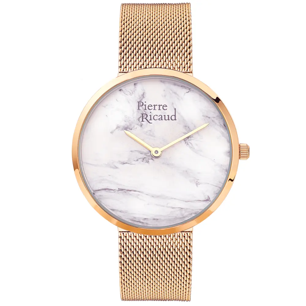 Moderan ženski ručni sat brenda Pierre Ricaud ima neobičan šareni brojčanik koji liči na prirodan kamen. Na pancir narukvici u roze- zlatnoj boji, ovaj model je namenjen svakoj prilici.