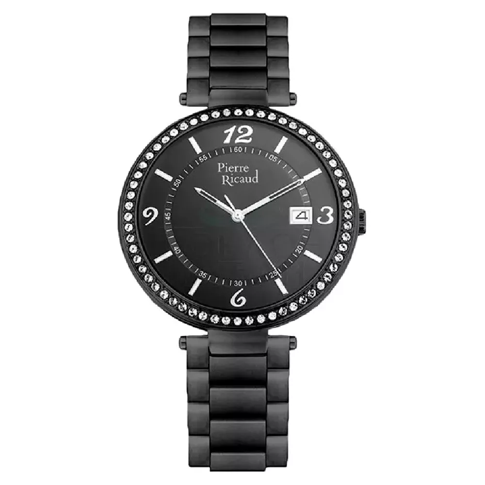 Moderan ženski ručni sat brenda Pierre Ricaud. Kućište je izrađeno od čelika u crnoj boji ukrašeno po obodu Swarovski kristalima u kombinaciji sa preglednim crnim brojčanikom koji nosi tanke indekse i kazaljke u boji srebra. Podržava ga crna narukvica od visokokvalitetnog nerđajućeg čelika koja pruža udobnost prilikom nošenja. Zahvaljujući dominantnoj crnoj boji ovaj model je lako uklopiv uz svakodnevne odevne kombinacije.