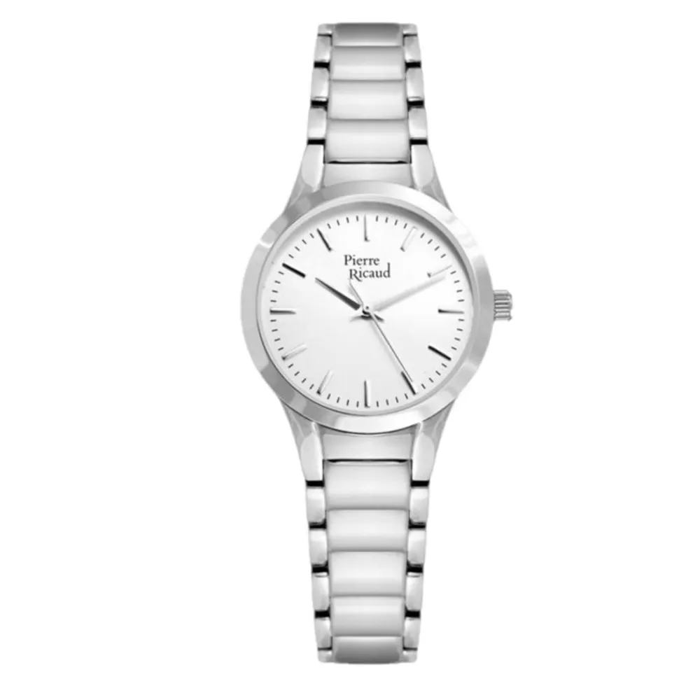 Ženski Pierre Ricaud sat. Narukvica i kućište su od nerđajućeg čelika. Beli brojčanik sa sivim indeksima savršeno ide uz narukvicu i pogodan je za svakodnevno nošenje.