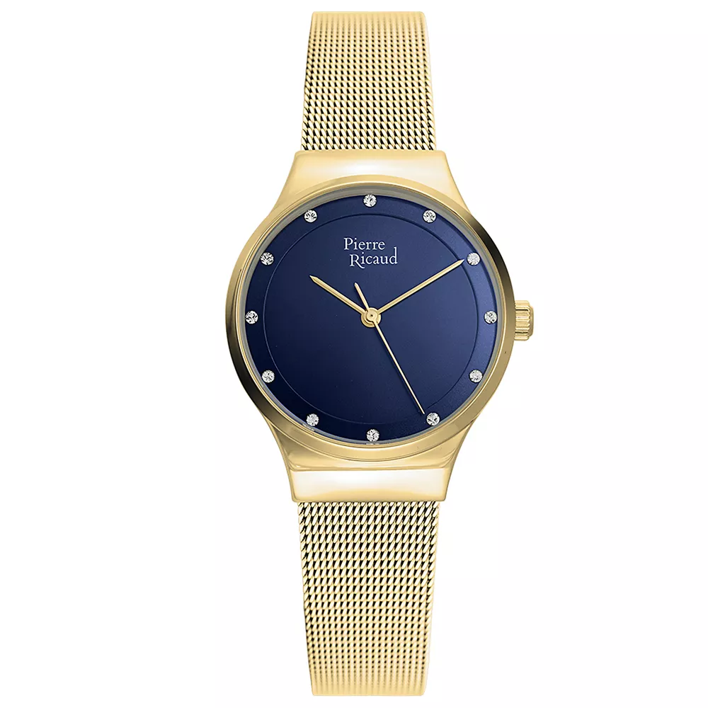Pierre Ricaud ženski ručni sat sa zlatnom pancir narukvicom i zlatnim kućištem. Plavi brojčanik sa indeksima od cirkona.