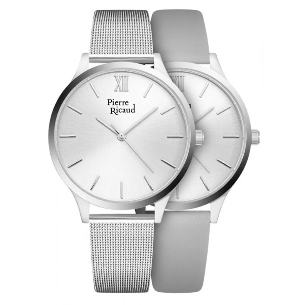 Pierre Ricaud set. Ženski sat sa srebrnim kućištem i srebrnim brojčanikom. Set sadrži srebrnu pancir i sivu kožnu narukvicu.