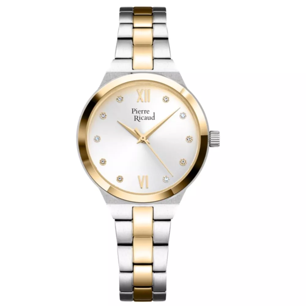 Pierre Ricaud Fashion je sofisticiran ženski sat izrađen od visokokvalitetnog nerđajućeg čelika sa zlatnim detaljima koji dodatno naglašavaju njegovu eleganciju. Brojčanik je ukrašen kristalima i izrađen tehnikom sunray brušenja, savršeno se uklapajući sa dvobojnom narukvicom. Sat pokreće precizan kvarcni mehanizam Citizen Miyota 2035. Opremljen je mineralnim staklom i poseduje vodootpornost do 30 metara, što ga štiti od manjih prskanja. Idealna kombinacija stila i pouzdanosti za svaki dan.