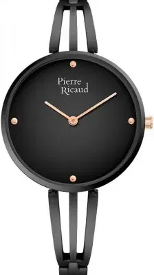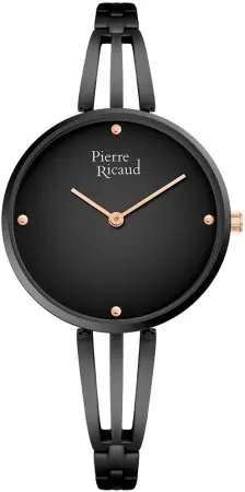 Ženski ručni sat brenda Pierre Ricaud. Ovaj klasični sat ima okruglo čelično kućište u crnoj boji, u koje je smešten tradicionalni analogni crni brojčanik sa četiri cirkona u funkciji indeksa. Celinu upotpunjuje uska udobna narukvica koja odlično izgleda na ženskom zglobu. Ovaj model namenjen je damama koje cene elaganciju.