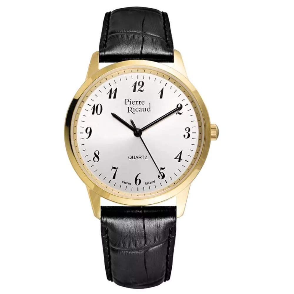 Elegantan muški sat marke Pierre Ricaud, savršen je izbor za osobe koje cene spoj klasičnog i modernog stila. Kuc´ište ovog sata je napravljeno od visokokvalitetnog nerđajuc´eg čelika, sa dodatkom PVD premazivanja u boji žutog zlata, što mu daje jedinstven karakter. Sat je opremljen crnim kožnim kaišem, koji se savršeno uklapa sa celokupnim dizajnom, pružajuc´i udobnost pri nošenju i elegantan izgled. Srebrni brojčanik sa sunčanim šlifom, zaštićen safirnim staklom, naglašava preciznost i eleganciju ovog modela. Arapski brojevi olakšavaju čitanje vremena, dok kvarcni mehanizam garantuje tačnost i pouzdanost. Dodatno, sat je vodootporan do 3 ATM, što ga štiti od slučajnog kontakta sa vodom, obezbeđujuc´i njegovu dugotrajnost u svakodnevnom korišc´enju. Ovaj model kombinuje eleganciju i funkcionalnost, idealan je za nošenje svakodnevno, ali i za posebne prilike.