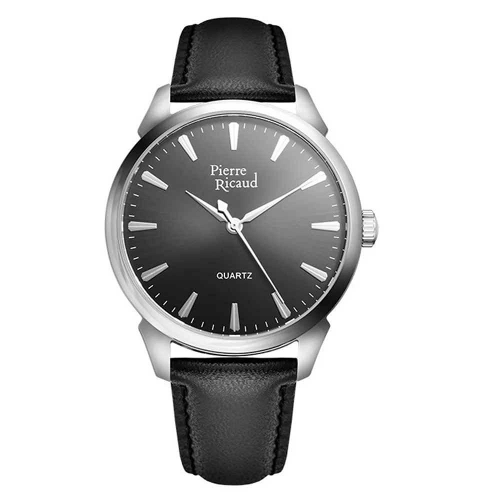 Moderan i elegantani model muškog ručnog sata brenda Pierre Ricaud, na kožnoj narukvici crne boje i crnog brojčanika.
