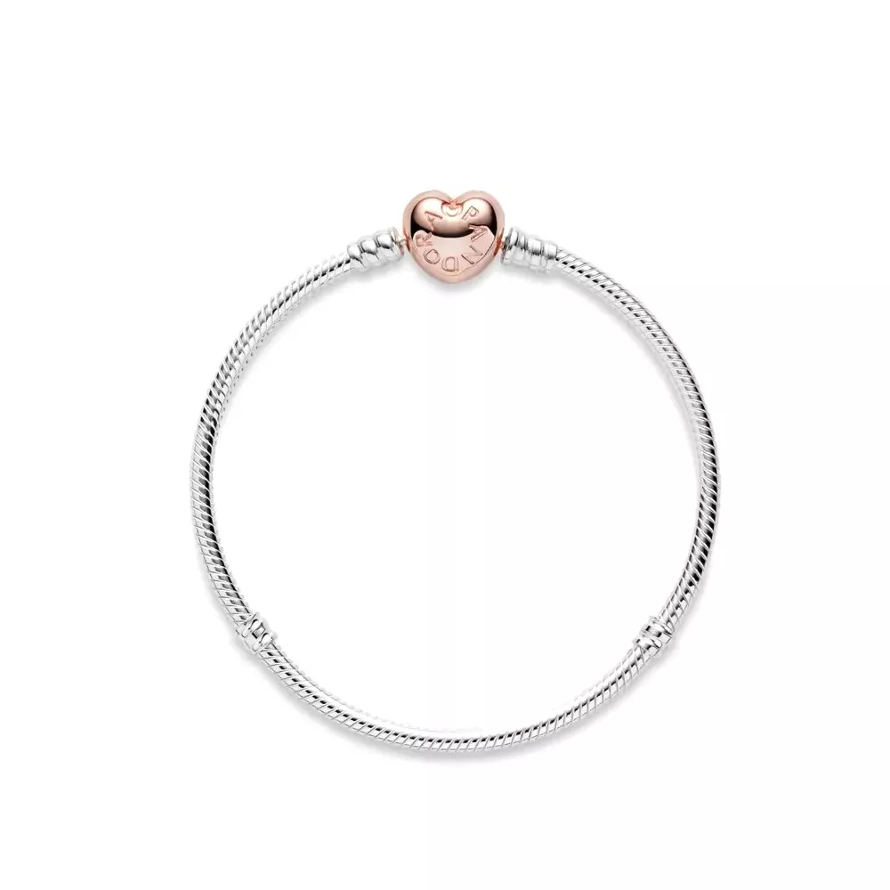 Klasična srebrna narukvica sa Pandora Rose kopčom u obliku srca. Pandora Rose je jedinstvena mešavina srebra i bakra sa 14k pozlatom i ne smatra se plemenitim metalom. Vrlo zanimljivog dizajina lako se uklapa za svaku priliku.