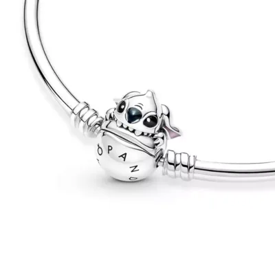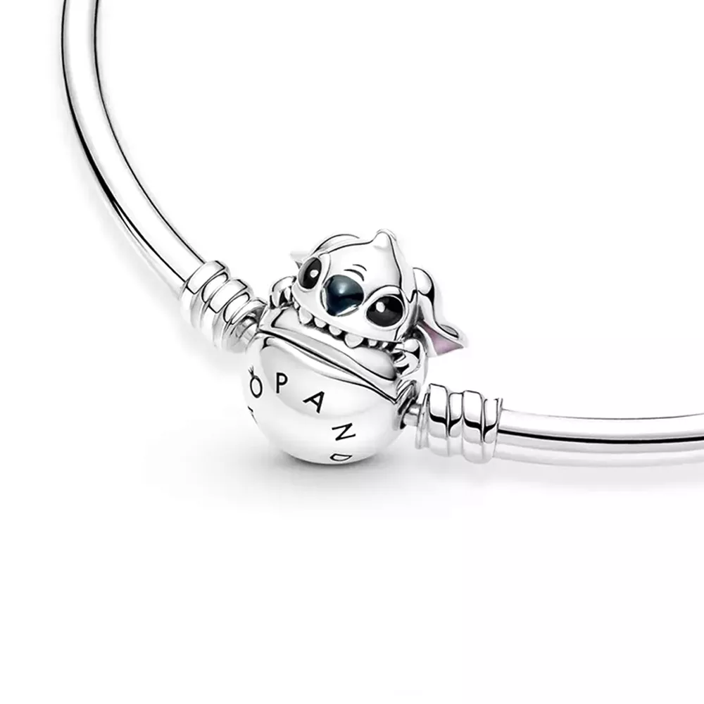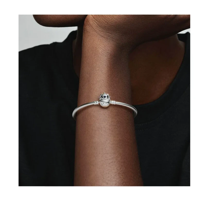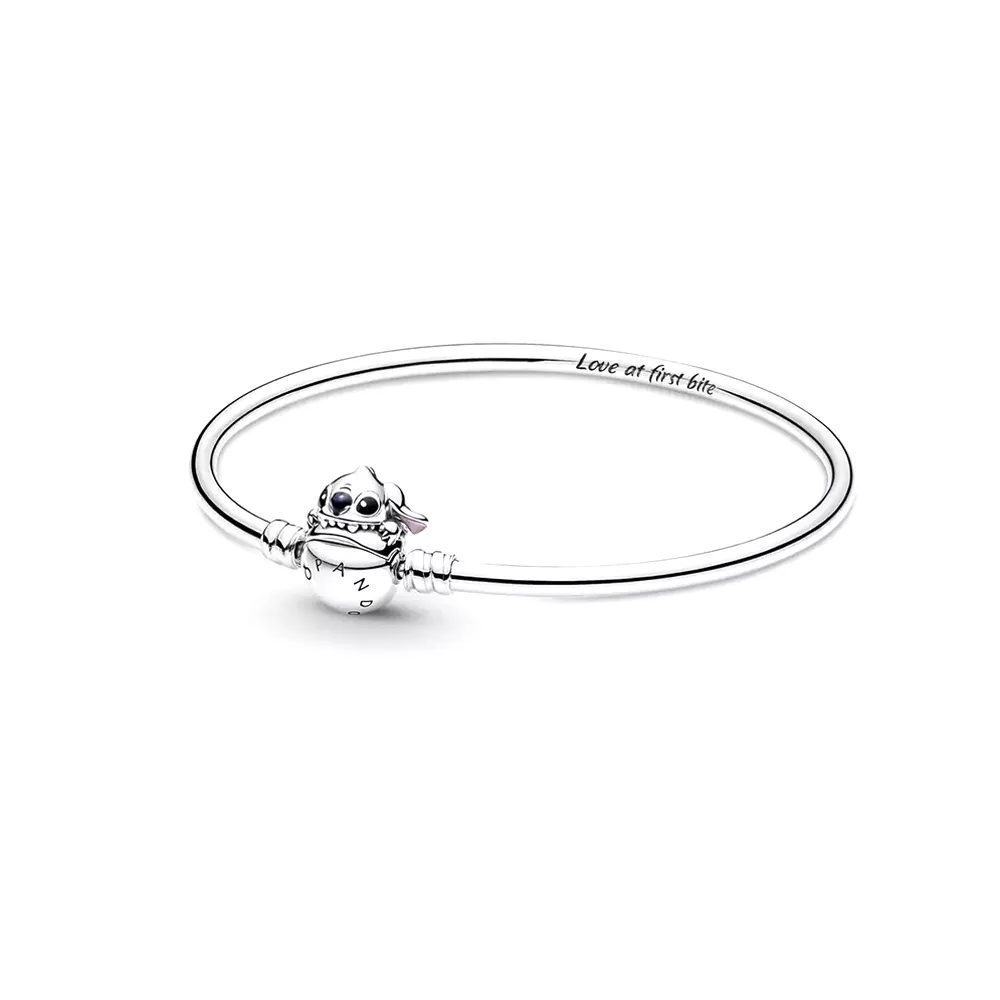 Naša klasična Pandora Moments kopča dobija novo ruho zahvaljujući popularnom Diznijevom Stiču. Ovaj vragolasti junak iz Diznijevog filma Lilo i Stič grize sferičnu kopču srebrne bangle narukvice (i predstavlja deo kopče). Na unutrašnjosti bangle narukvice ugravirana je poruka „Love at first bite“. Na bangle narukvici se može nositi do 16–18 privezaka, visećih privezaka ili privezaka – to je savršen dom za tvoju Disney x Pandora kolekciju privezaka.