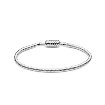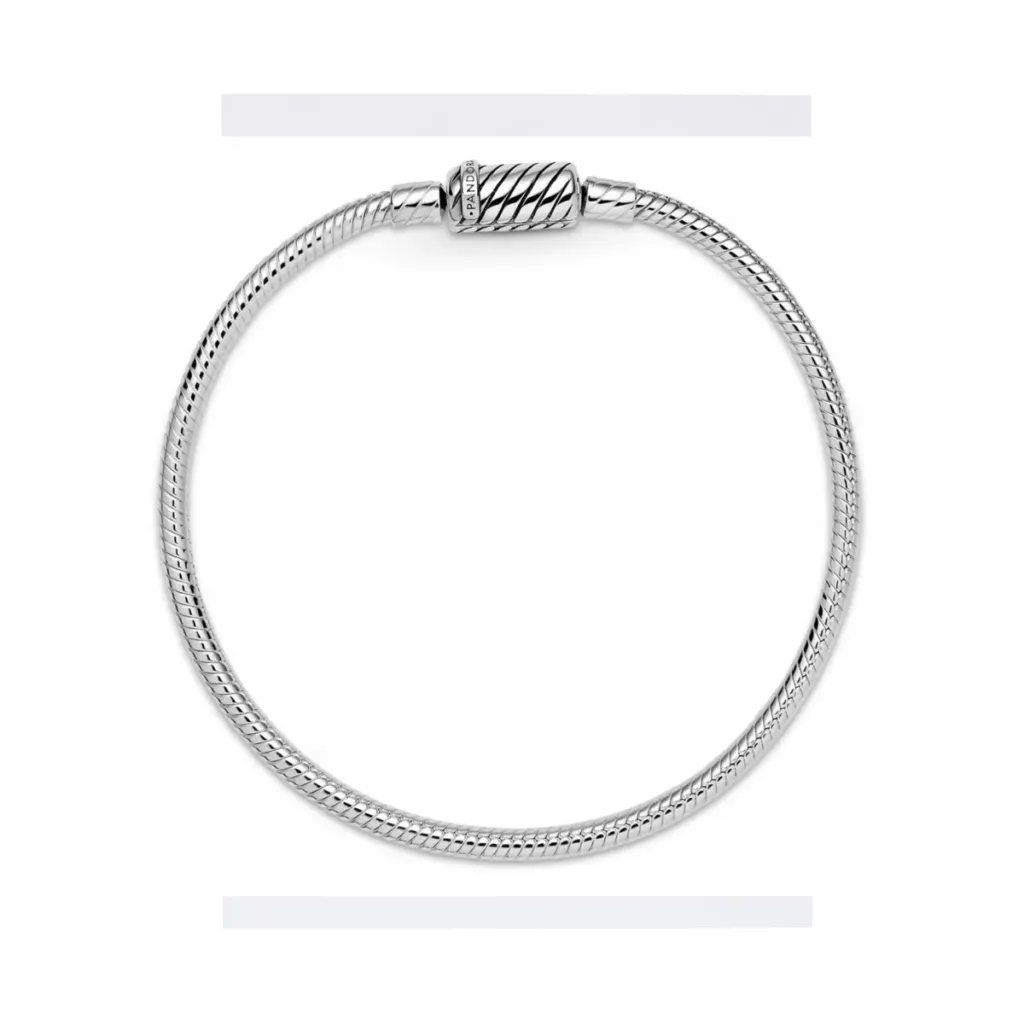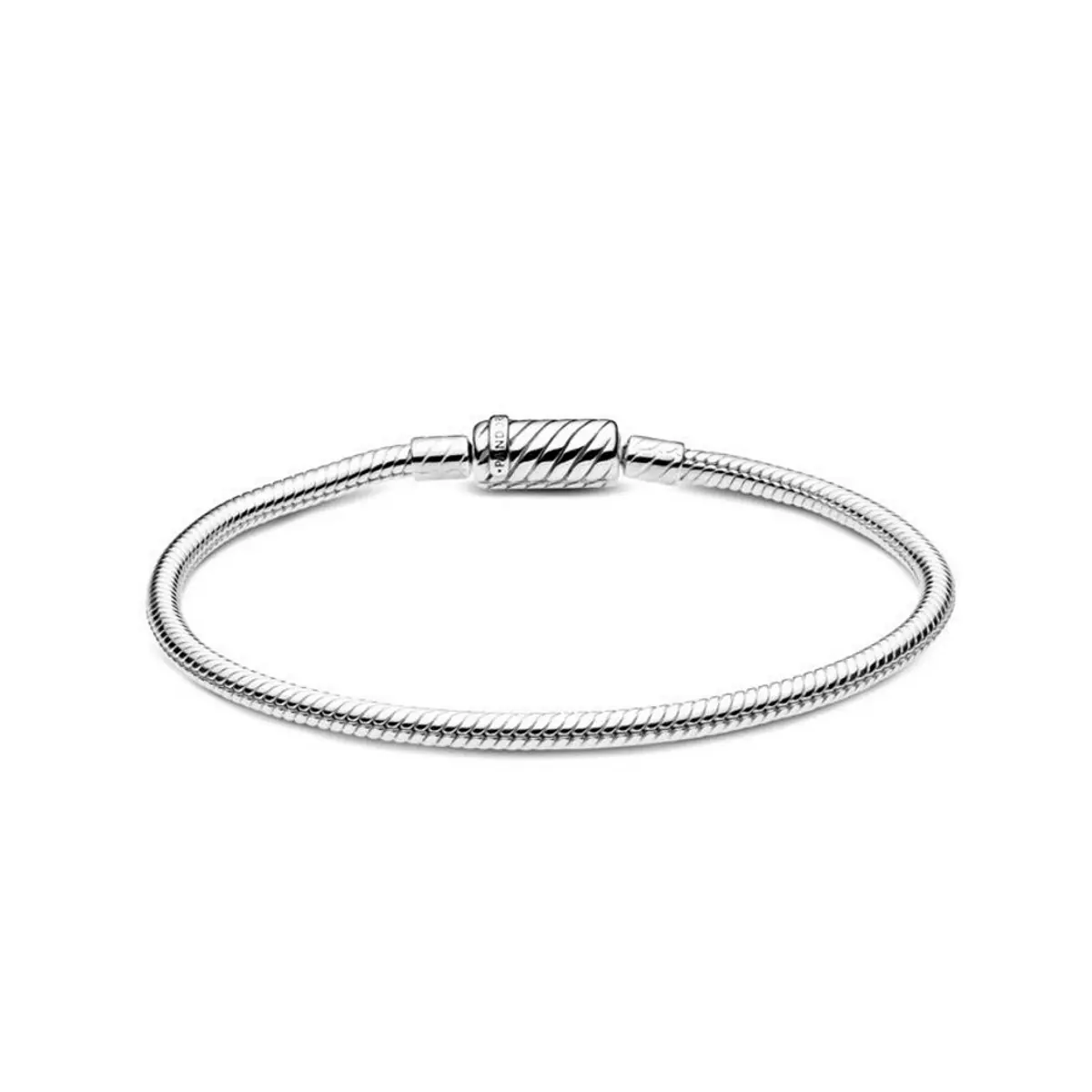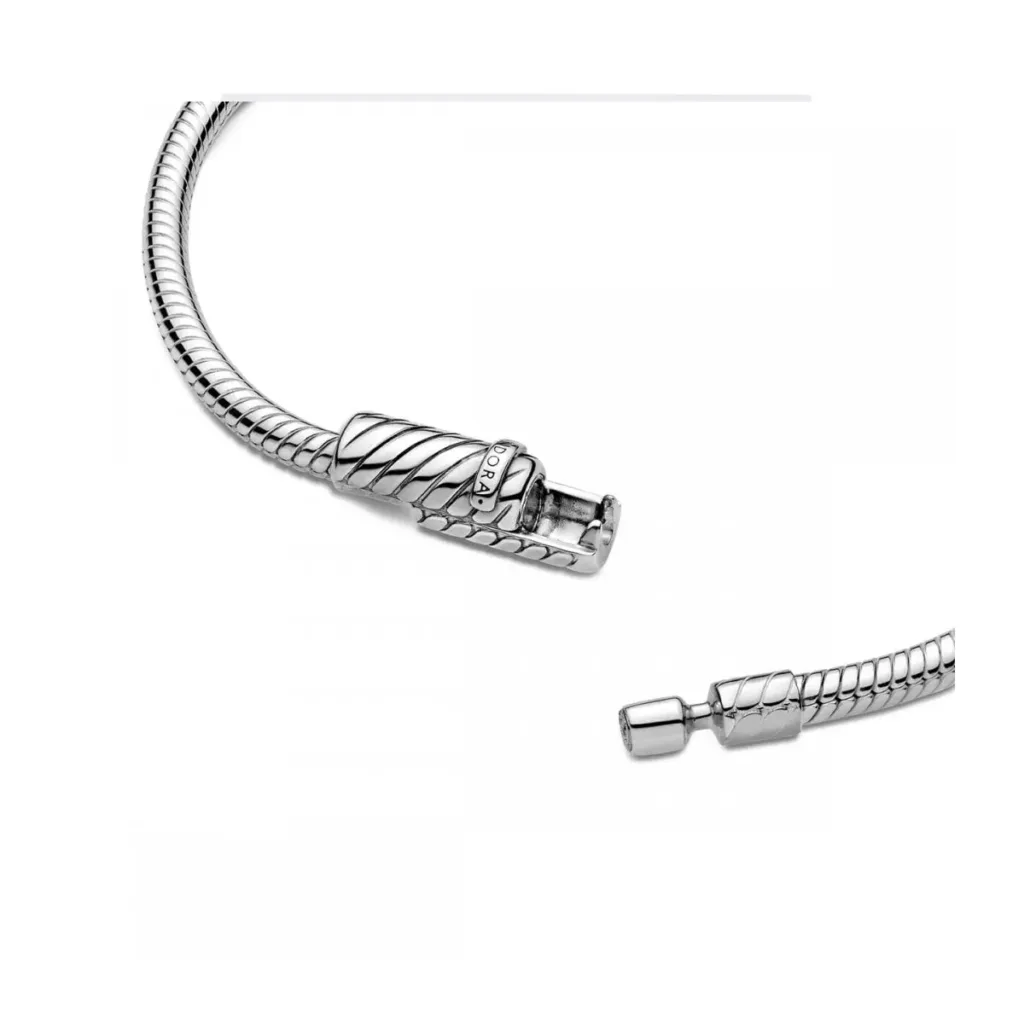 Obogatite svoju kolekciju uz narukvicu Pandora Moments sa zmijskim vezom i magnetnom kliznom kopčom. Kao nova interpretacija čuvene narukvice Pandora Moments sa zmijskim vezom, ovaj primjerak ručno je dovršen od čistog srebra. Jednostavno povucite unazad povišeni držač s logotipom Pandora na vrhu kopče kako bi ste otvorili narukvicu i oslobodili magnetski vrh. Povucite istu kopču unazad i vratite magnetski vrh da biste je zakopčali. Stilizujte ovu narukvicu s 15 – 20 malih i visećih privesaka Pandora Moments.