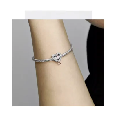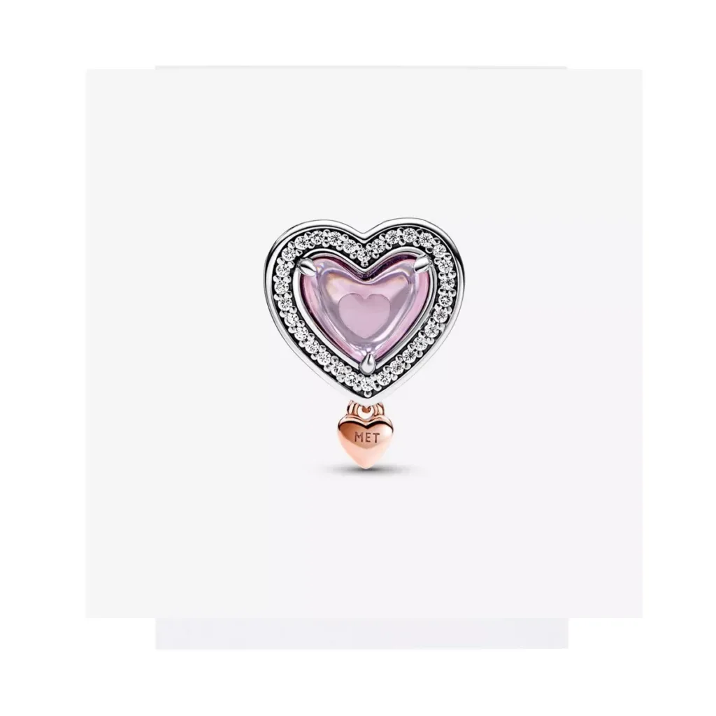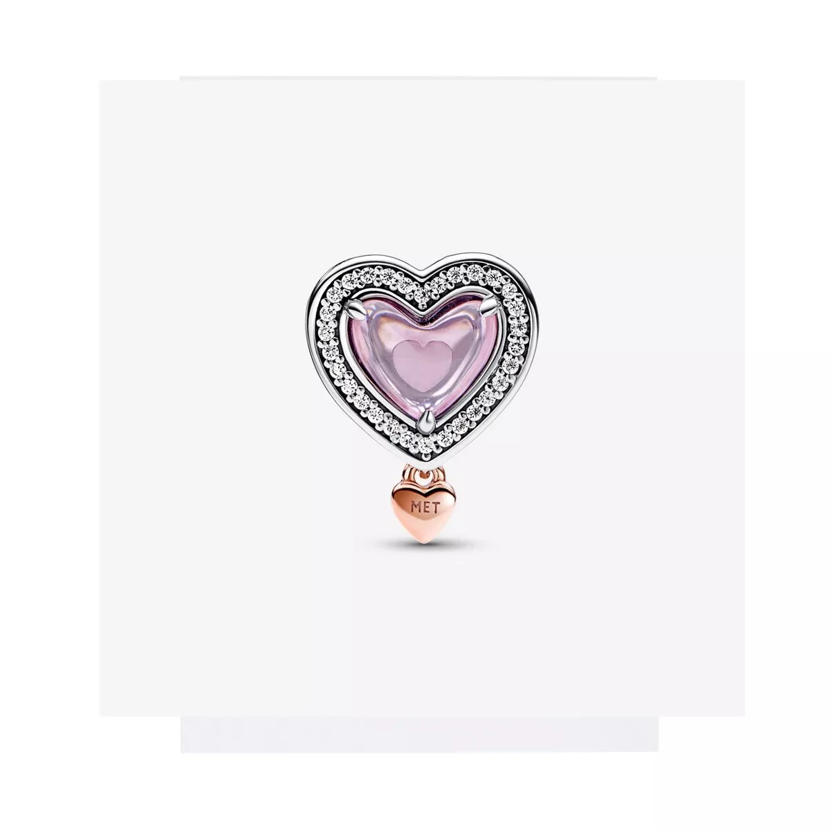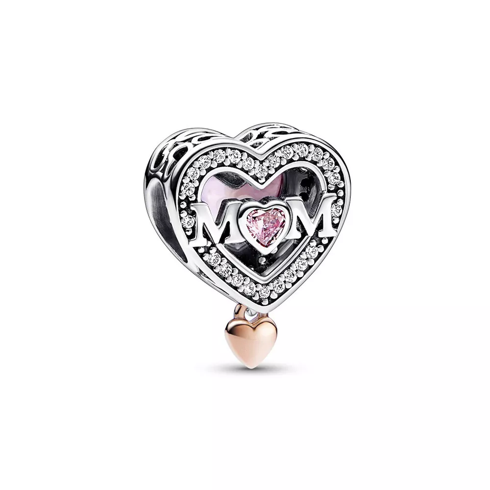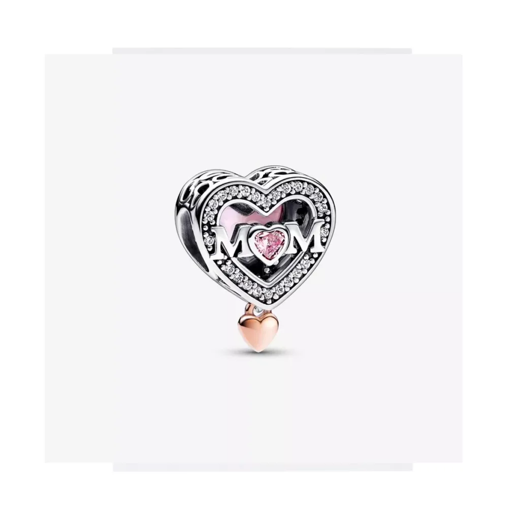 Dvobojni šupljikasti privezak Mum i srce je posvećen svim fantastičnim mamama u našim životima. Ovaj srebrni šupljikasti privezak u obliku srca krase roze kabošon u obliku srca sa jedne strane i ugravirano srce na poleđini koje se vidi kroz kamenčić i daje mu zamagljen izgled. Sa druge strane priveska je reč „M♥m“ od pisanih srebrnih slova sa roze kamenčićem u obliku srca kao centralnim slovom. Obe strane priveska su oivičene pavé prozirnim kockastim cirkonima i izrezanim srcima koja se pružaju po ivicama. Malo viseće srce od roze pozlate visi na dnu priveska. Pokloni nakit darovan od srca i pokaži svoju zahvalnost onoj koja te je odgajila.