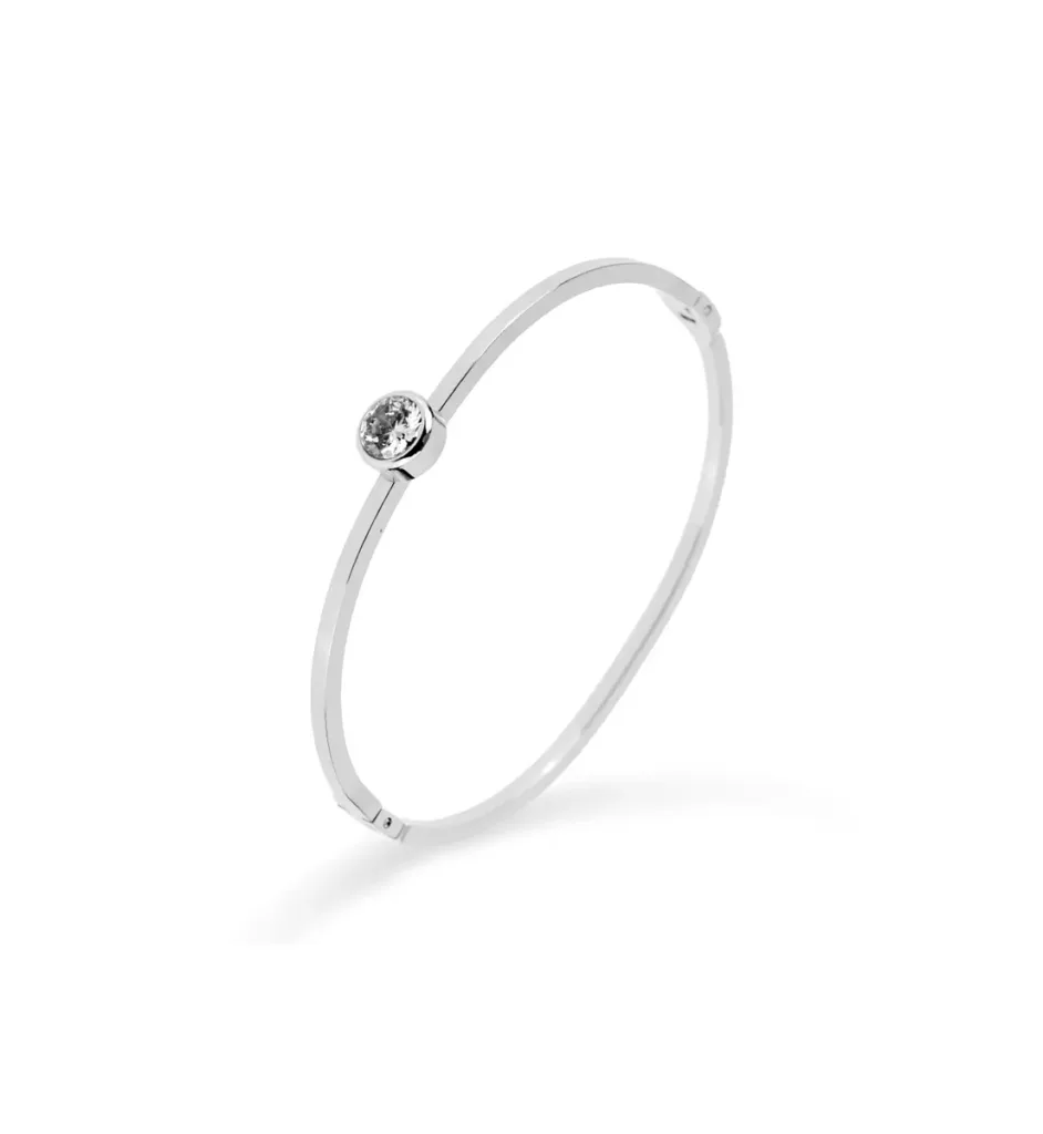 Elegantna, čvrsta narukvica brenda Pierre Ricaud u srebrnoj boji, sa nežnim kristalom transparentne boje i okruglog oblika na sredini, vrlo lepo naleže na ručni zglob i nenametljivo ističe ženstvenost i stil osobe koja je nosi. Lagana je i predstavlja lako uklopivi i efektan aksesoar uz svakodnevni odevni stil.