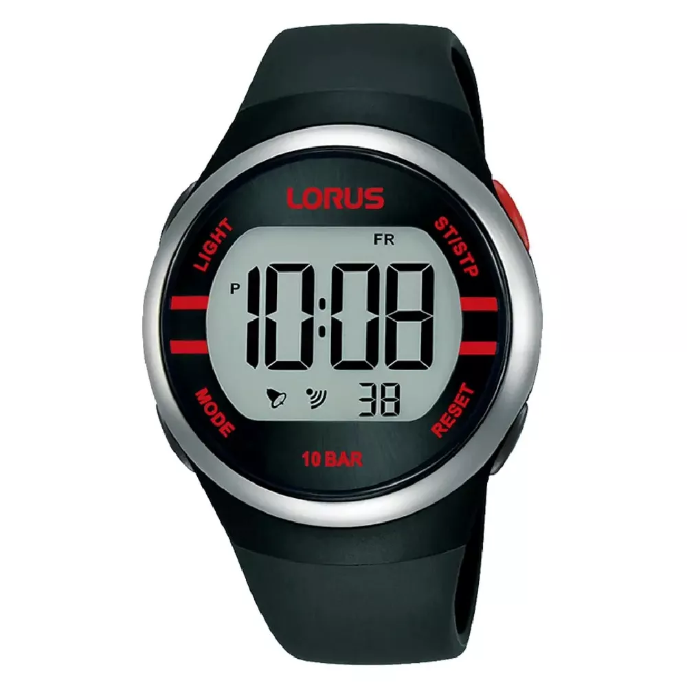 Sportski sat brenda Lorus je iz Seikove Korporacije u crmoj boji. Preglednog je digitalnog displeja, sa mnoštvom funkcija. Podržava ga udobna elastična silikonska narukvica crne boje. Ima dobru vodootpornost pa je prikladan za plivanje i za druge sportske aktivnosti.