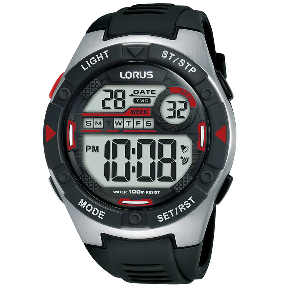 Muški sportski sat brenda Lorus u crnoj boji sa crvenim detaljima ima pregledan digitalni displej, sa mnoštvom funkcija. Podržava ga udobna,elastična silikonska narukvica u crnoj boji. Ima dobru vodootpornost pa je prikladan za plivanje i za druge sportske aktivnosti.
