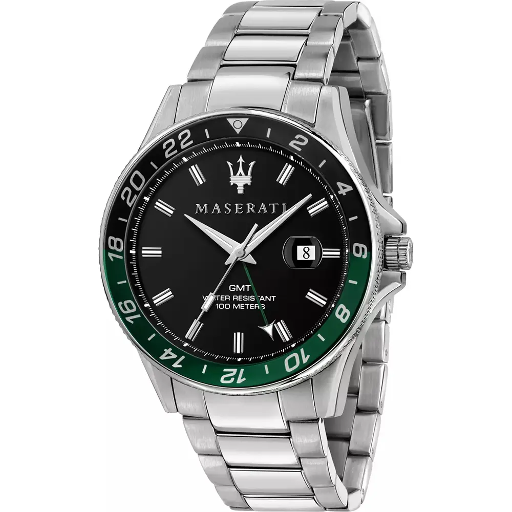 Elegantan muški sat brenda Maserati. Čelično kućište sa crnim brojčanikom ima na sebi diskretne indekse i diskretan datum. Narukvica je izrađena od hiruškog čelika. Ovaj model je pogodan za svakodnevno nošenje.
