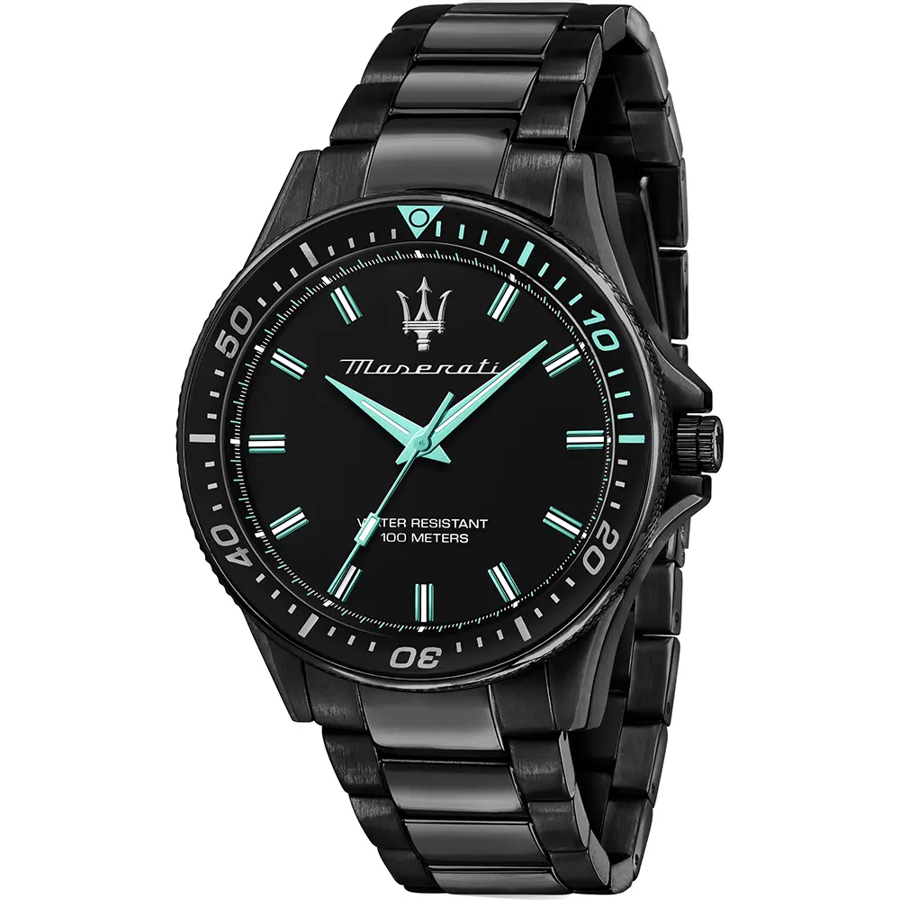 Muški ručni sat od brenda Maserati. Sportski model izrađen od nerđajućeg čelika u crnoj boji sa indeksima tirkizne boje. Multifunkcionalni model atraktivnog izgleda. Posebna je serija koja kombinuje noćnu crnu boju istaknutu sa gotovo floroscentnom akva bojom.