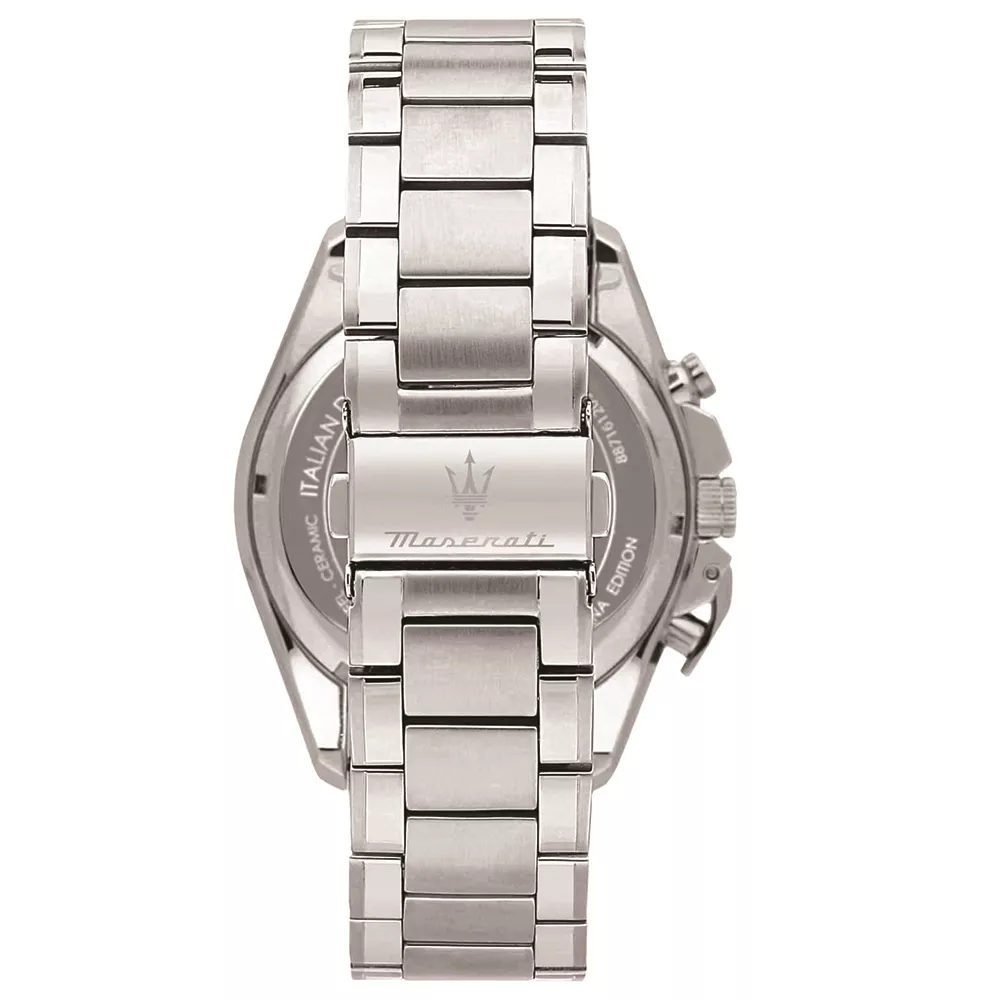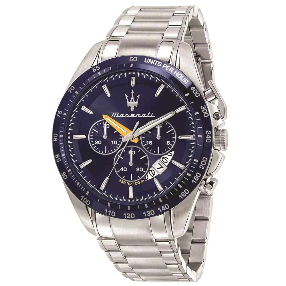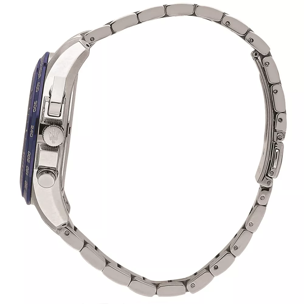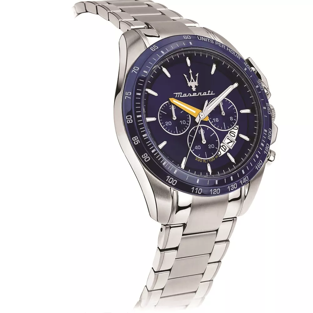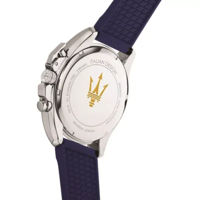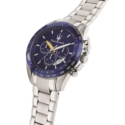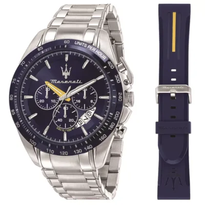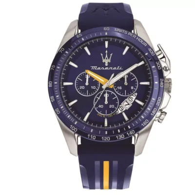 Muški ručni sat brenda Maserati iz kolekcije Traguardo, klasičnog je dizajna. Poseduje sportsku notu prožetu moćnim detaljima. Brojčanik je u plavoj boji sa detaljima u kombinaciji srebrne i bele boje sa određenim funkcijama. Karakteriše ga čelično kućište srebrne boje i silikonska narukvica. Upečatljiv i inspirativan model namenjen aktivnim ljudima.
