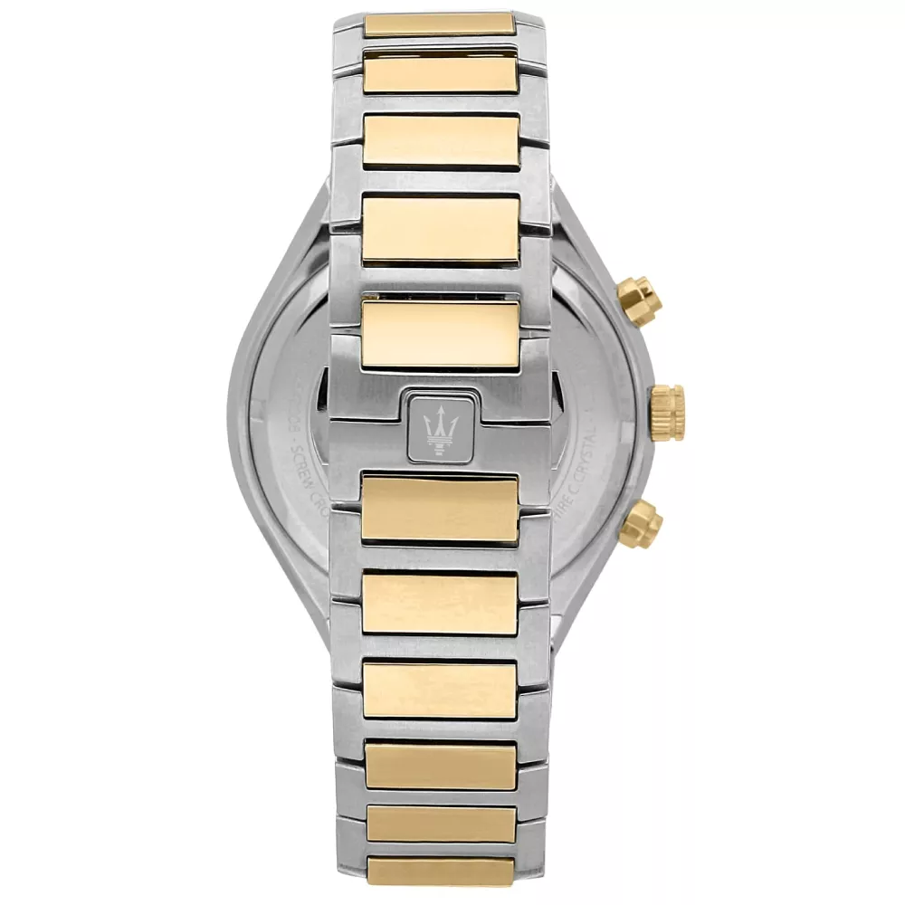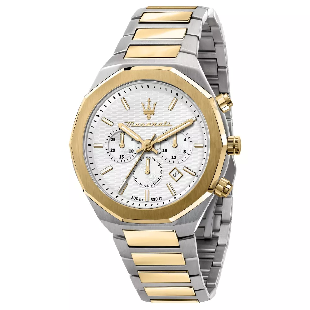 Sportski sat brenda Maserati, modernog dizajna inspirisan je aktivnim životom i sportom. Karakteriše ga masivno kućište sa brojčanikom bele boje na kome se ističu kazaljke zlatne boje, koje doprinose preglednosti sata . Sat je kompletiran čeličnom narukvicom srebrno-zlatne boje koja pruža savršenu udobnost prilikom nošenja.