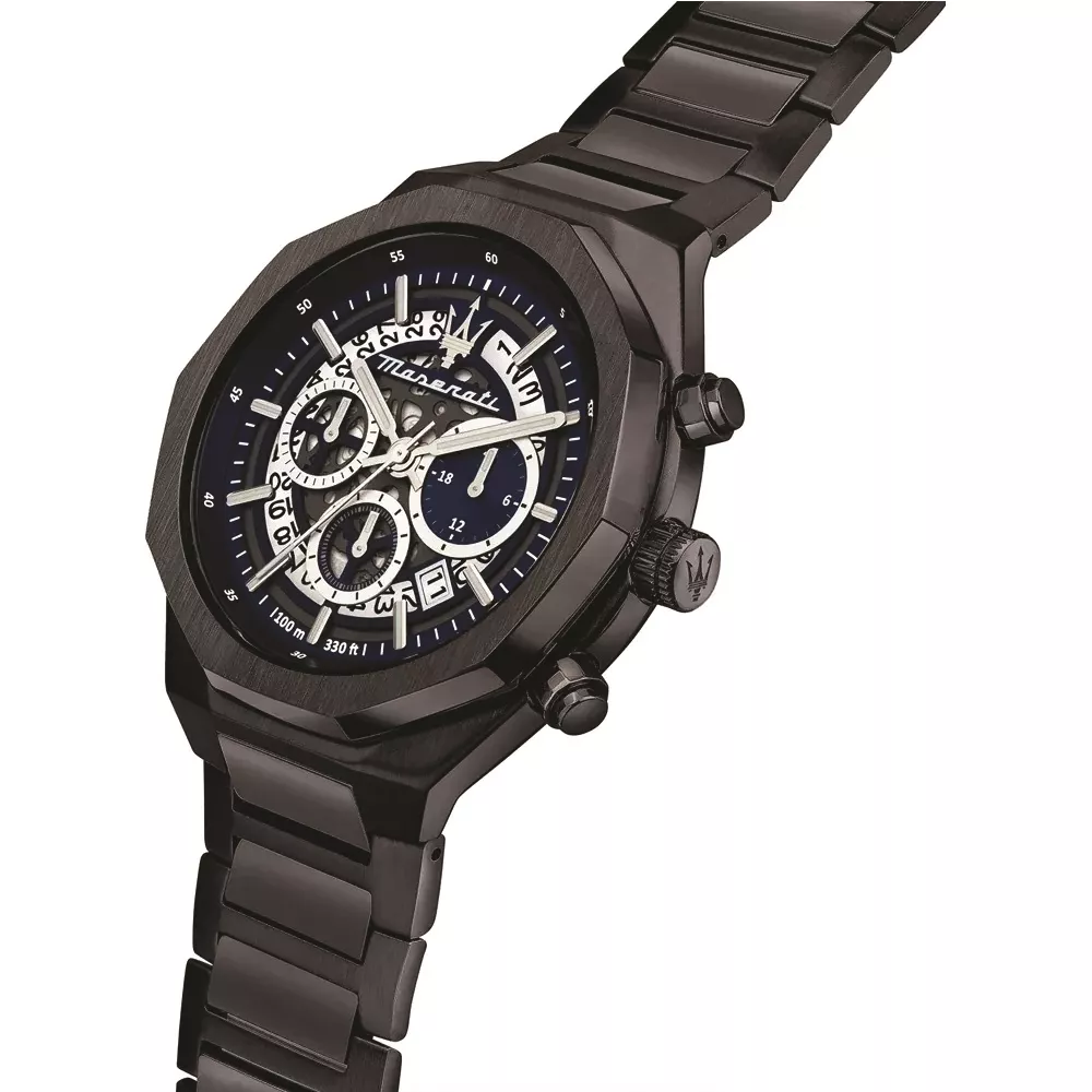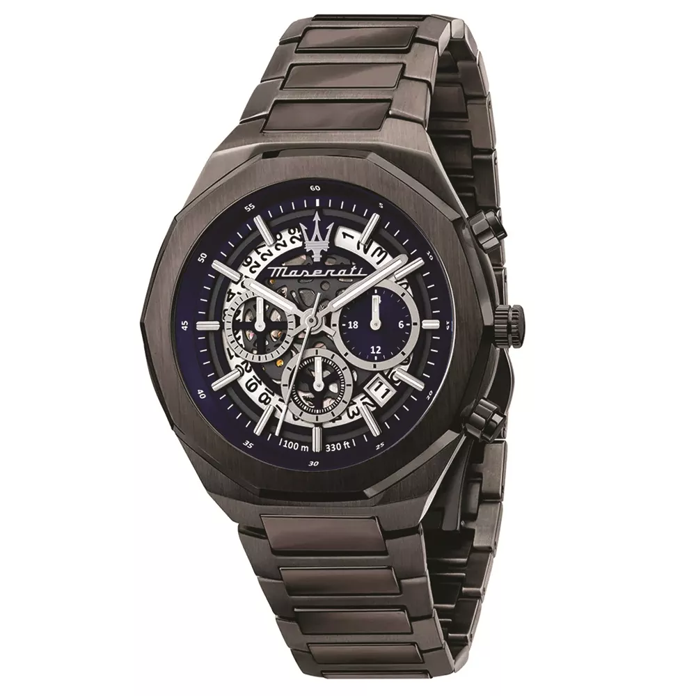 Maserati je italijanski luksuzni i eksluzivni brend koji se fokusira na kvalitet i dizajn osnovan 1914. godine. Ovaj Maserati sat iz kolekcije Stile opremljen je Miyota kvarcnim mehanizmom. Sat je vodootporan do dubine od 100 metara (10 ATM). To znači da je sat otporan na plivanje i lagano ronjenje. Ipak, nije klasifikovan kao ronilački sat, stoga ne preporučujemo ronjenje dublje od 2 metra. Opremljen je minearlnim staklom sa safirnim premazom. Jedinstveni skeletni brojčanik koji otkriva mehanizam, kombinovan sa plavom pozadinom daje mu jedinstveni dodir. Sat poluprečnika oktagonalnog kućišta sa open heart brojčanikom u plavoj boji je 45mm debljine 12mm sa prikazom datuma i silikonskom narukvicom.