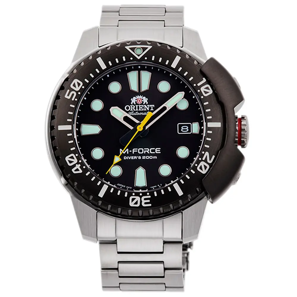 Sportski muški ručni sat japanskog brenda Orient iz kolekcije M-FORCE. Poseduje automatski mehanizam kalibra F6727. Rezerva snage 40 sati. Kućište i narukvica izrađeni od nerđajućeg čelika u srebrnoj boji. Brojčanik je crni sa svetlećim kazaljkama u srebrnim tonovima i tačkastim oznakama sata. Poseban i odvažan sportski dizajn ovog modela predstavlja pravi izbor svakog muškarca.
