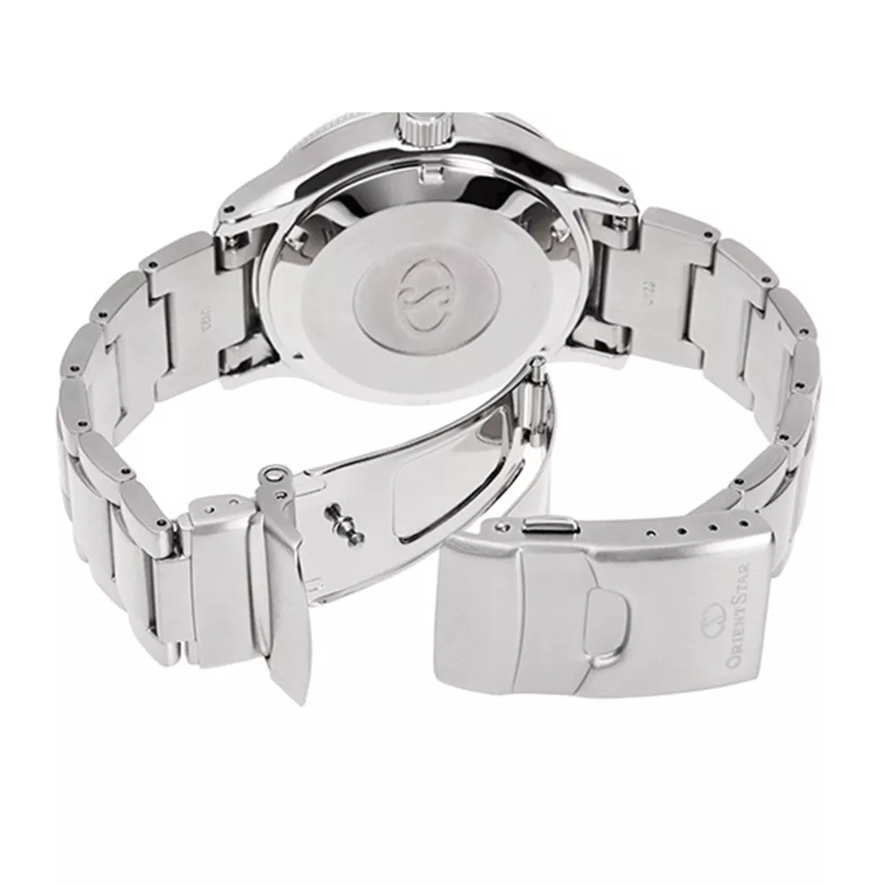 Automatic muški ručni sat prepoznatljivog brenda Orient Star predstavnik je sportske linije satova za ronjenje, vanvremenskog dizajna i vrhunskog časovničarskog majstorstva. Kućište je izrađeno od visokokvalitetnog nerđajućeg čelika, u koji je smešten brojčanik tamnoplave nijanse, kao jedan od simbola dubina. Na njemu se nalaze indikator napunjenosti rezervne snage i prikaz datuma, a indeksi i kazaljke imaju luminescentni sloj radi bolje preglednosti pri korišćenju. Staklo kojim je sat zatvoren je safirni kristal, jedan od najkvalitetnijih materijala otpornih na ogrebotine i oštećenja koji se koristi u časovničarskom svetu, sa antirefleksivnim premazom. Pokreće ga japanski mehanizam kalibra F6N47 sa 22 dragulja. Sat ima specijalno dizajnirane delove koji osiguravaju dodatnu otpornost na potrese, uz koje ovaj ronilački sat ispunjava kriterijume ISO standarda. Ovaj model ima vodootpornost do 200m i dolazi sa dodatnom silikonskom narukvicom crne boje koju možete kombinovati po vašoj želji.
