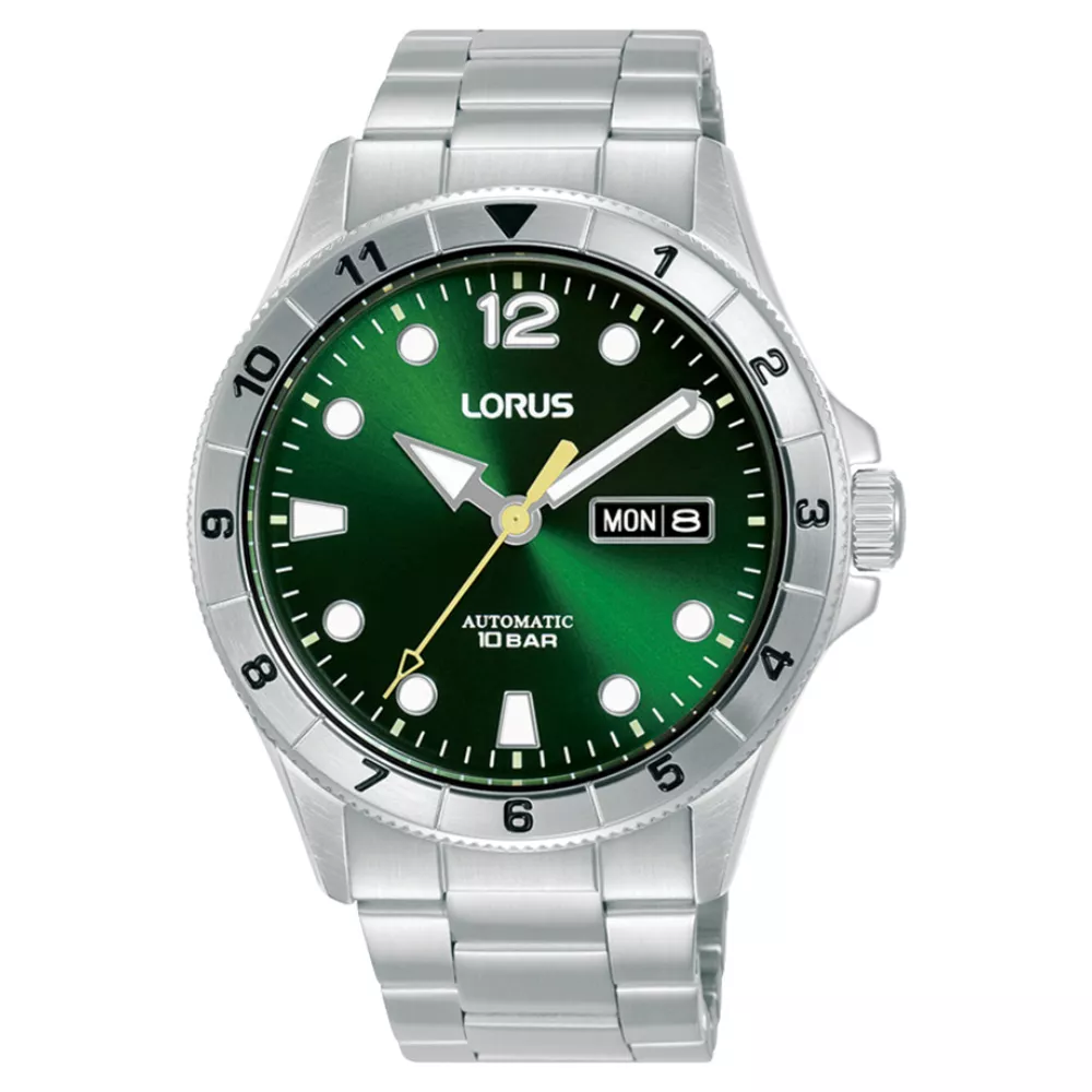 Muški sat koji se ističe svojom elegancijom i naprednom tehnologijom. Srebrno kućište i narukvica od nerđajućeg čelika savršeno se uklapaju sa zelenim brojčanikom na kojem privlači pažnju sunčani efekat. Sat ima automatski mehanizam, što znači da se sam navija prilikom nošenja, eliminišući potrebu za ručnim navijanjem. Funkcije prikaza datuma za dan u mesecu i dan u nedelji, luminescentni premaz na kazaljkama i markerima, kao i vodootpornost do 100 metara, čine ga izuzetno praktičnim. Transparentno kućište sa zadnje strane omogućava posmatranje mehanizma u pokretu. Ovo je odličan izbor za muškarce koji cene kombinaciju klasičnog i modernog stila.
