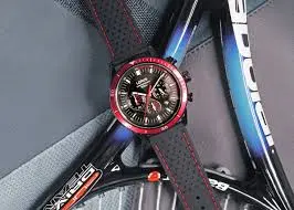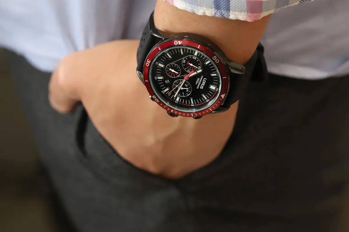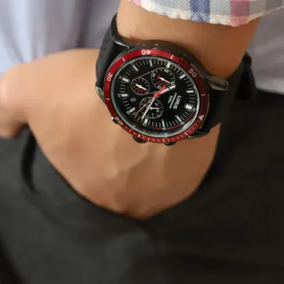 Muški sportski ručni sat brenda Lorus ima crni brojčanik sa crvenim detaljima, crnu silikonsku narukvicu sa crvenim štepom i kućište od nerđajućeg čelika u crnoj boji sa linetom crvene boje.Od dodatnih funkcija ima hronograf, 12/24 h prikaz vremena i prikaz datuma.