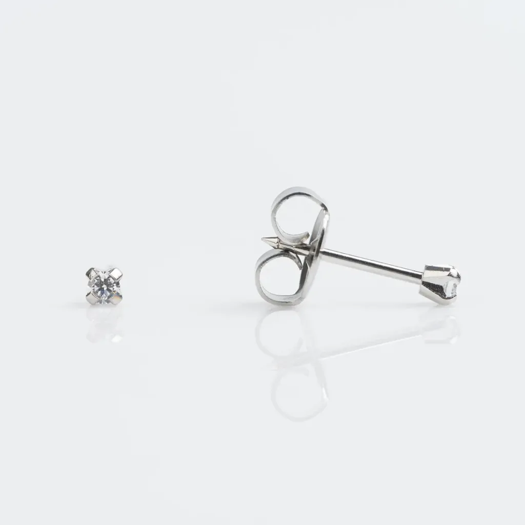 Studex minđuše prečnika 2mm za bušenje ušiju od visokokvalitetnog antialergijskog hirurškog čelika, okrugli beli kristal u sterilnom pakovanju.
