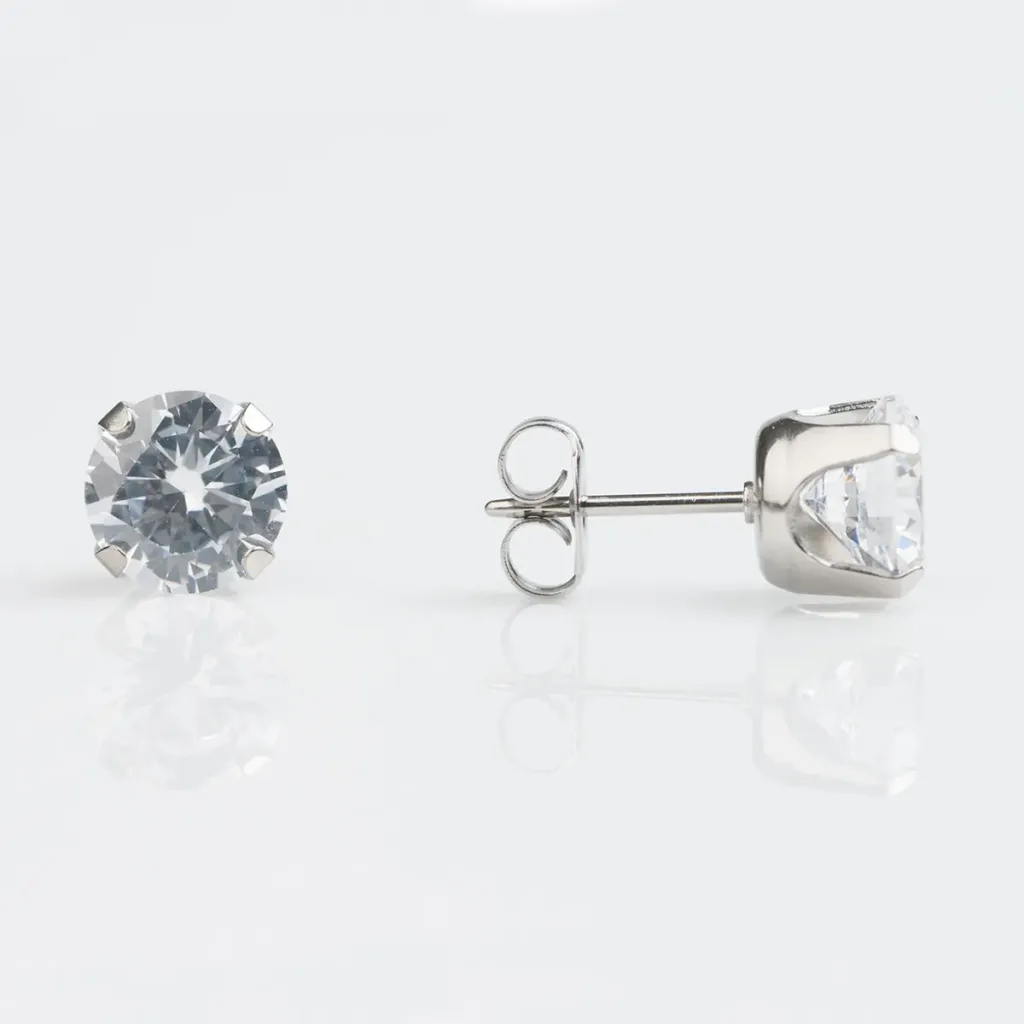 Studex minđuše prečnika 7mm za bušenje ušiju od visokokvalitetnog antialergijskog hirurškog čelika, okrugli beli kristal u sterilnom pakovanju.
