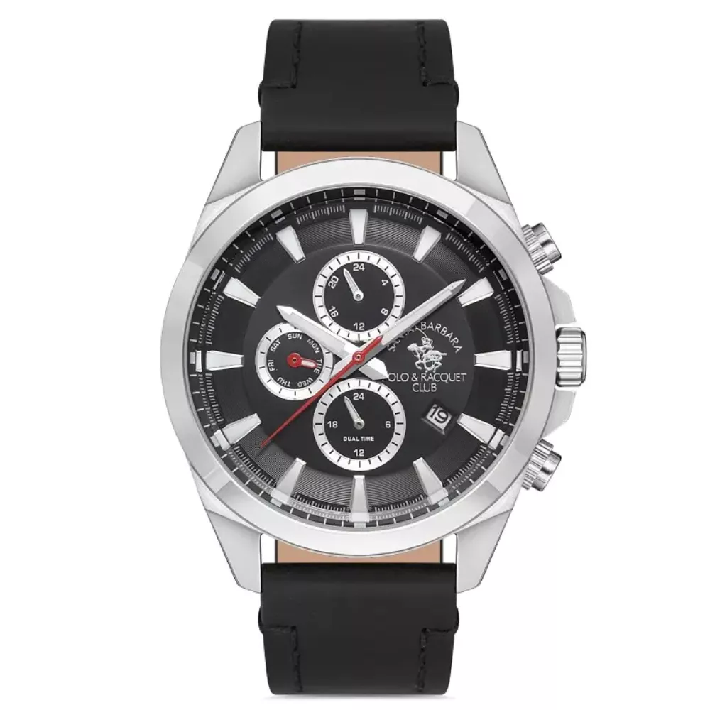 Multifunkcionalni muški ručni sat brenda Santa Barbara Polo. Karakteriše ga crni brojčanik sa istaknutim podbrojčanicima i crna kožna narukvica koja čini ovaj model pogodnim za svakodnevno nošenje.