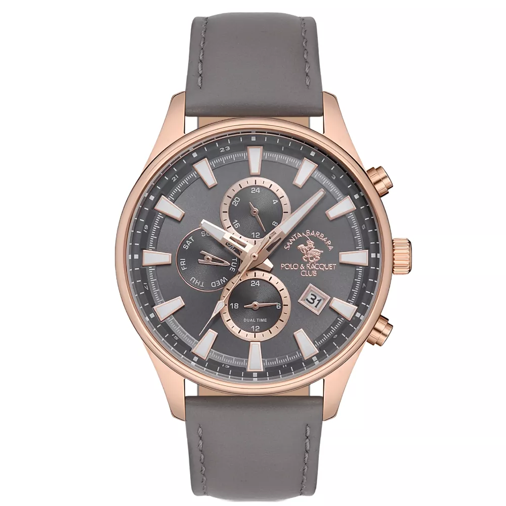 Multifunkcionalni muški ručni sat brenda Santa Barbara Polo. Roze zlatno kućište saa je izrađeno od nerđajućeg čelika. Karakteriše ga tamno sivi brojčanik sa istaknutim podbrojčanicima koji uključuju prikaz trenutnog datuma i dana, kao i vreme u formatu 12/24 sata. Pored toga, poseduje funkciju dual time, omogućavajući prikaz dva različita vremenska pojasa. Tamno siva kožna narukvica čini ovaj model pogodnim za svakodnevno nošenje.
