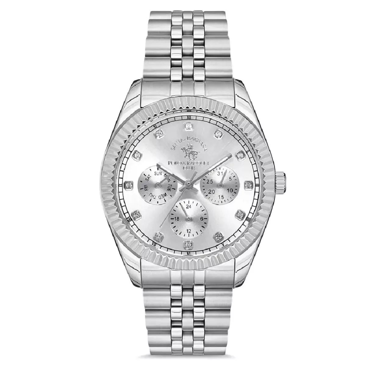 Ženski ručni sat brenda Santa Barbara Polo. Karakteriše ga narukvica srebrne boje i kućište koje je dodatno istaknuto diskretnim cirkonima što čini ovaj model atraktivnim i pogodnim za svakodnevno nošenje.