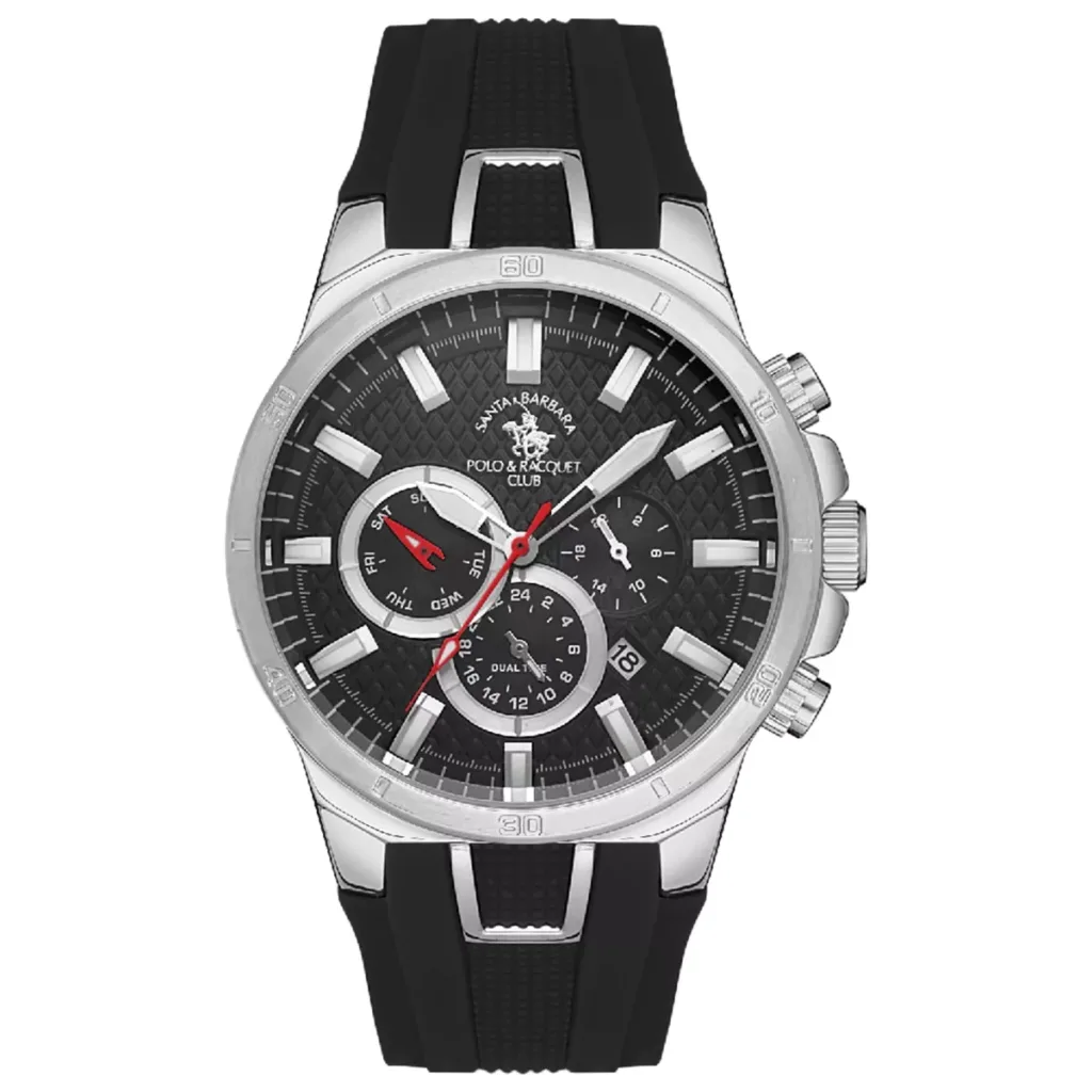 Multifunkcionalni muški ručni sat brenda Santa Barbara Polo. Karakteriše ga crni brojčanik sa istaknutim podbrojčanicima i crna silikonska narukvica koja čini ovaj model pogodnim za svakodnevno nošenje.