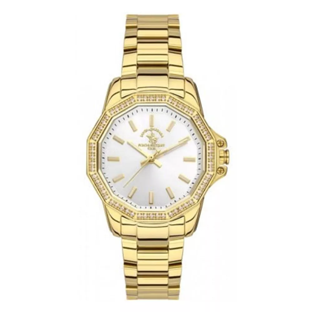 Ženski ručni sat brenda Santa Barbara Polo iz kolekcije Luxury. Model sa brojčanikom jedinstvenog dizajna u beloj boji, a narukvica od istog materijala dolazi u zlatnom tonu. Elegantan sat koji će svojim izgledom privlačiti poglede.