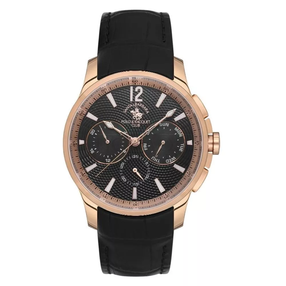 Multifunkcionalni muški ručni sat brenda Santa Barbara Polo. Karakteriše ga crni brojčanik sa istaknutim podbrojčanicima i crna kožna narukvica koja čini ovaj model pogodnim za nošenje u specijalnim prilikama.